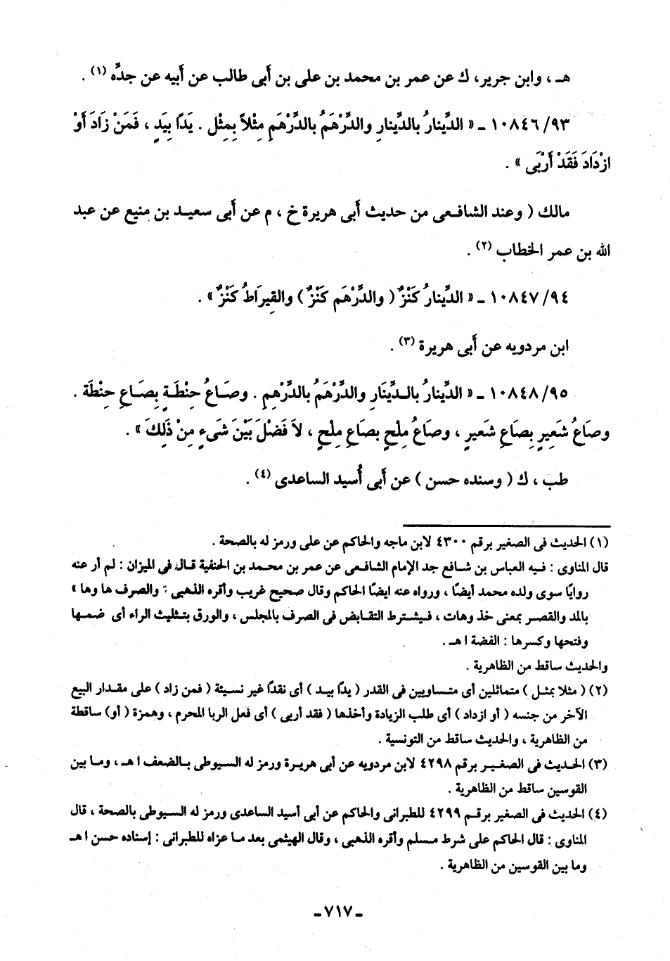 95/ 10848 - "الدِّينارُ بالدِّينارِ والدِّرْهَمُ بالدِّرْهم. وصَاعُ حِنْطَه بِصَاع حِنْطَة.