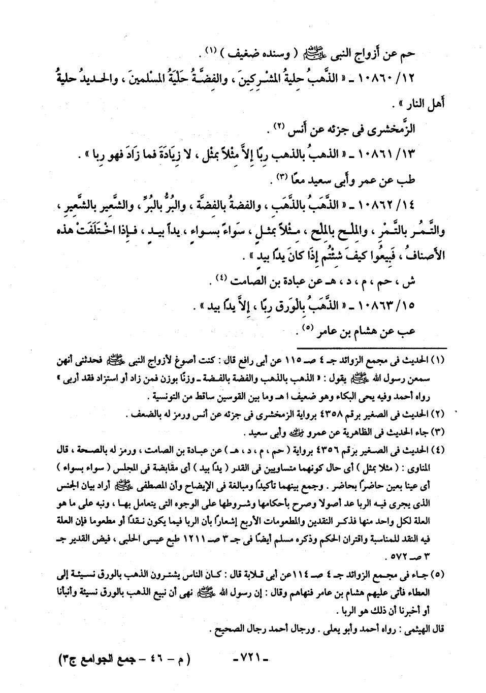 (¬5) جاء في مجمع الزوائد ج 4 ص 114 عن أَبي قلابة قال: كان الناس يشترون الذهب بالورق نسيئة إلى العطاء فأتى عليهم هشام بن عامر فنهاهم وقال: إن رسول الله - صلى الله عليه وسلم - نهى أن نبيع الذهب بالورق نسيئة وأنبأنا أو أخبرنا أن ذلك هو الربا.