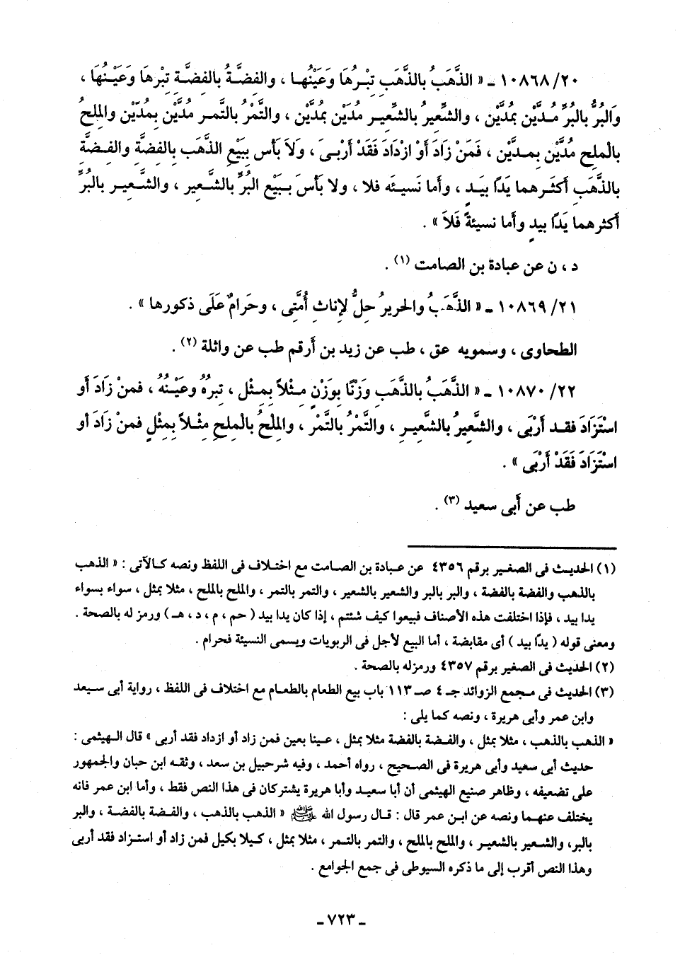 22/ 10870 - "الذَّهَبُ بالذَّهَبِ وَزنًا بِوَزْنٍ مِثْلًا بمثْل، تبرُهُ وعَينُهُ، فمنْ زَادَ أَو اسْتَزَادَ فقد أَرْبَى، والشَّعِير الشَّعِيرِ، والتَّمْرُ بالتَّمْر، والمِلْحُ بالمِلْحَ مِثْلًا بِمِثْلٍ فمنْ زَادَ أو اسْتَزَادَ فَقَدْ أَرْبَى".
