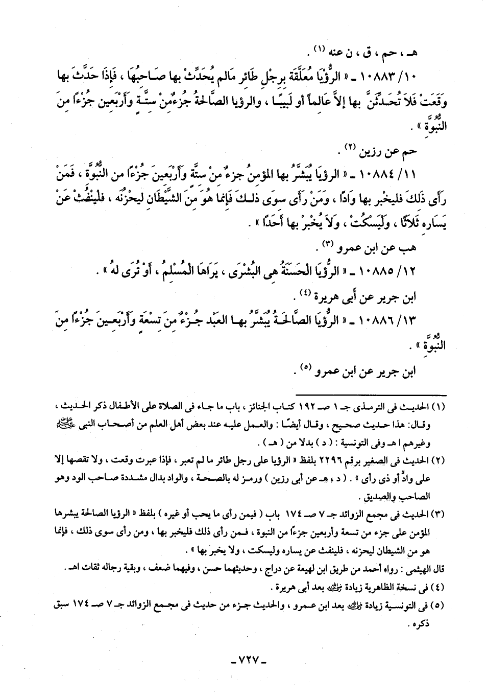 (¬3) الحديث في مجمع الزوائد ج 7 ص 174 باب (فيمن رأى ما يحب أو غيره) بلفظ "الرؤيا الصالحة يبشرها المؤمن على جزء من تسعة وأربعين جزءًا من النبوة، فمن رأى ذلك فليخبر بها، ومن رأى سوى ذلك، فإنما هو من الشيطان ليحزنه، فلينفث عن يساره وليسكت، ولا يخبر بها".
