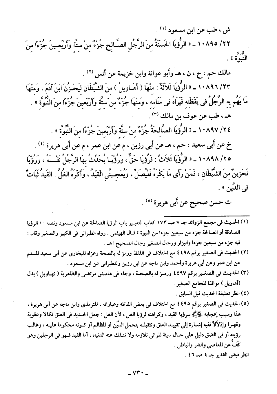(¬1) الحديث في مجمع الزوائد جـ 7 صـ 173 كتاب التعبير باب الرؤيا الصالحة عن ابن مسعود ونصه: "الرؤيا الصادقة أو الصالحة جزء من سبعين جزءًا من النبوة" قال الهيثمي. رواه الطبراني في الكبير والصغير وقال: فيه جزء من سبعين جزءًا والبزار ورجال الصغير رجال الصحيح اهـ.