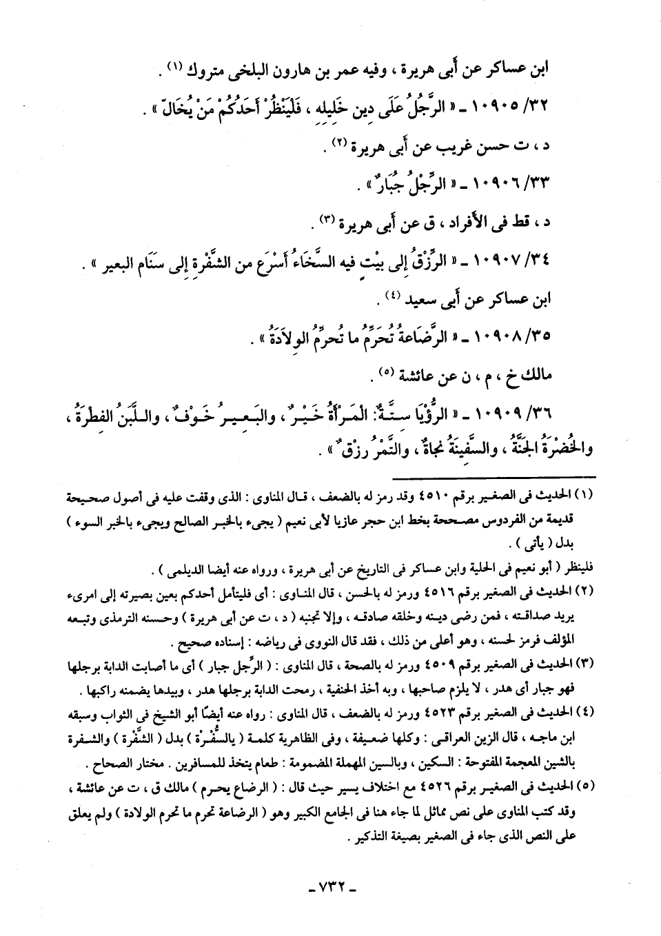 (¬5) الحديث في الصغير برقم 4526 مع اختلاف يسير حيث قال: (الرضاع يحرم) مالك ق، ت عن عائشة، وقد كتب المناوي على نص مماثل لما جاء هنا في الجامع الكبير وهو (الرضاعة تحرم ما تحرم الولادة) ولم يعلق على النص الذي جاء في الصغير بصيغة التذكير.
