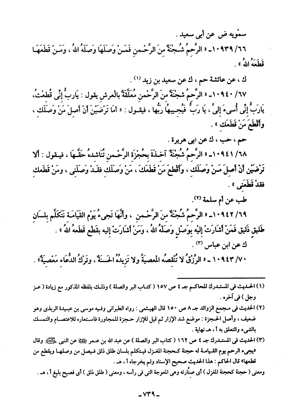 (¬3) الحديث في المستدرك ج 4 ص 162 (كتاب البر والصلة) عن عبد الله بن عمر - رضي الله عنه - عن النبي - صلى الله عليه وسلم - وقال "يجئ الرحم يوم القيامة له حجنة كحجنة المغزل فيتكلم بلسان طلق ذلق فيصل من وصلها ويقطع من قطعها، قال الحاكم: هذا الحديث صحيح الإسناد ولم يخرجاه أ، هـ.