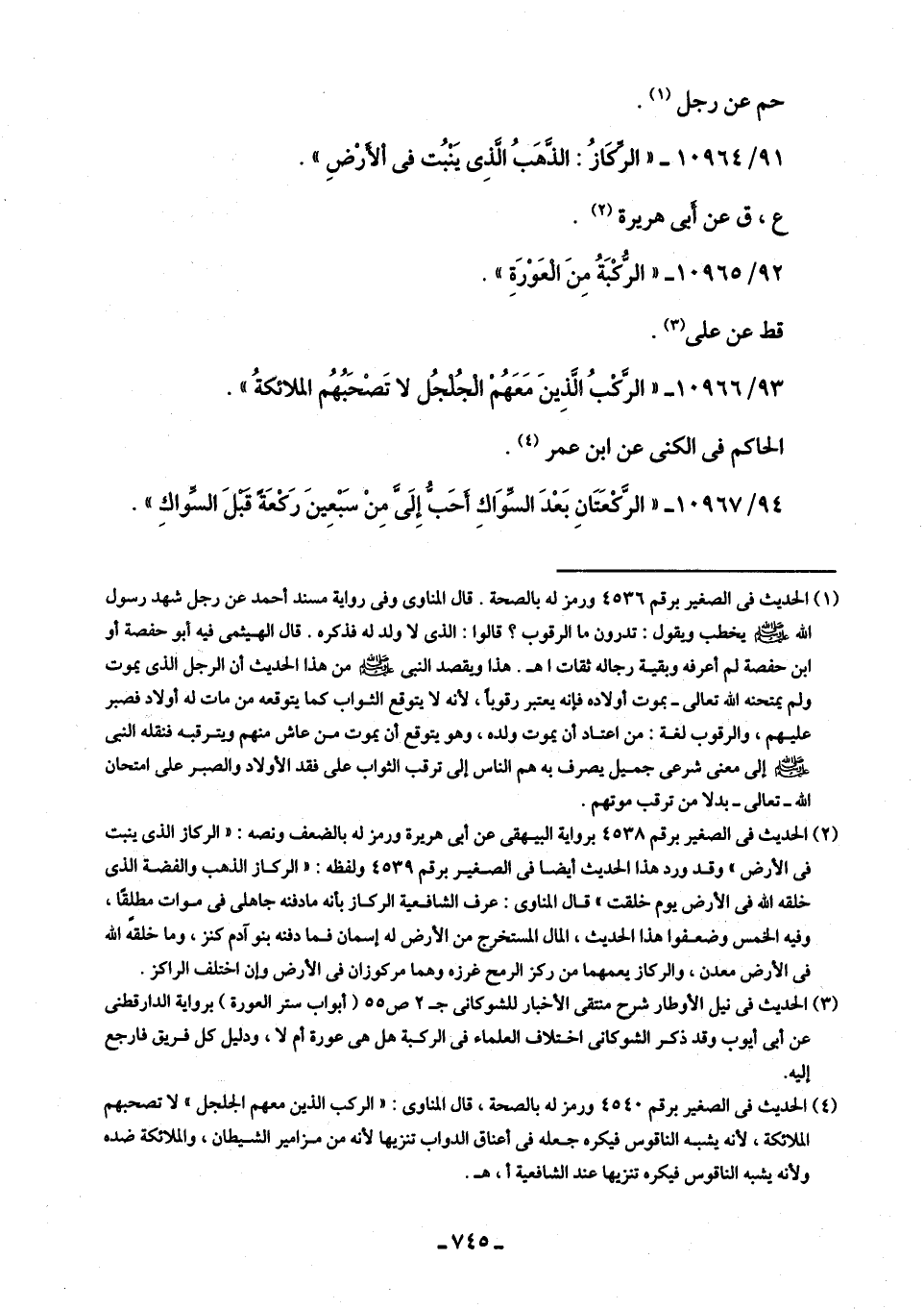 (¬2) الحديث في الصغير برقم 4538 برواية البيهقي عن أبي هريرة ورمز له بالضعف ونصه: "الركاز الذي ينبت في الأرض" وقد ورد هذا الحديث أيضًا في الصغير برقم 4539 ولفظه: "الركاز الذهب والفضة الذي خلقه الله في الأرض يوم خلقت" قال المناوى: عرف الشافعية الركاز بأنه ما دفنه جاهلى في موات مطلقًا، وفيه الخمس وضعفوا هذا الحديث، المال المستخرج من الأرض له إسمان فما دفنه بنو آدم كنز، وما خلقه الله في الأرض معدن، والركاز يعمهما من ركز الرمح غرزه وهما مركوزان في الأرض وإن اختلف الراكز.
