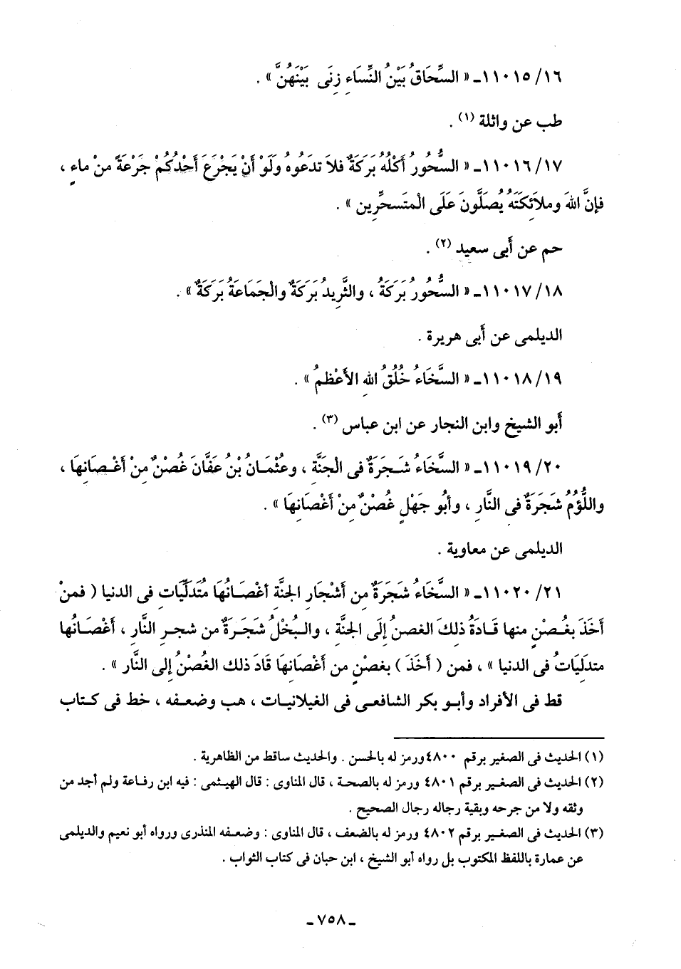 21/ 11020 - "السَّخَاءُ شَجَرَةٌ مِن أَشْجَارِ الجنَّةِ أغْصَانُهَا مُتَدَلِّيَاتِ في الدنيا (فمنْ أَخَذَ بغُضنٍ منها قَادَةُ ذلِكَ الغصنُ إِلَى الجنَّةِ، والبُخْلُ شَجَرَةٌ من شجرِ النَّارِ، أَغْصَانُها متدَلِيَاتُ في الدنيا"، فمن (أَخَذَ) بغصْنٍ من أَغْصَانِهَا قَادَ ذلك الغُصْنُ إِلى النَّار".