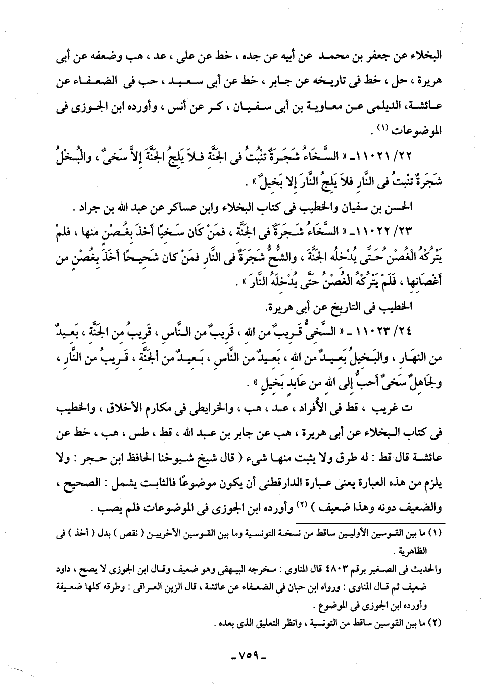 ت غريب، قط في الأفراد، عد، هب، والخرايطى في مكارم الأخلاق، والخطيب في كتاب البخلاء عن أبي هريرة، هب عن جابر بن عبد الله، قط، طس، هب، خط عن عائشة قال قط: له طرق ولا يثبت منها شيء (قال شيخ شيوخنا الحافظ ابن حجر: ولا يلزم من هذه العبارة يعني عبارة الدارقطني أن يكون موضوعًا فالثابت يشمل: الصحيح، والضعيف دونه وهذا ضعيف) (¬2) وأورده ابن الجوزي في الموضوعات فلم يصب.