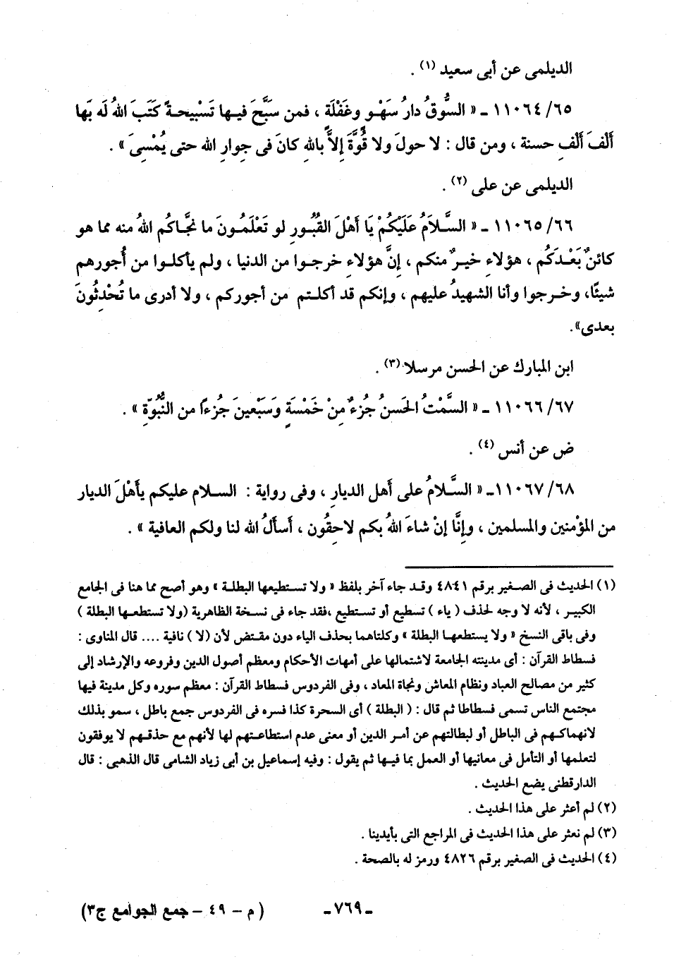 66/ 11065 - "السَّلامُ عَلَيكُمْ يَا أَهْلَ القُبُورِ لو تَعْلَمُونَ ما نجَّاكم اللهُ منه مما هو كائنٌ بَعْدَكم، هؤلاء خيرٌ منكم، إِنَّ هؤلاءِ خرجوا من الدنيا، ولم يأكلوا من أُجورهم شيئًا، وخرجوا وأنا الشهيدُ عليهم، وإنكم قد أكلتم من أجوركم، ولا أدرى ما تُحْدِثُونَ بعدى".