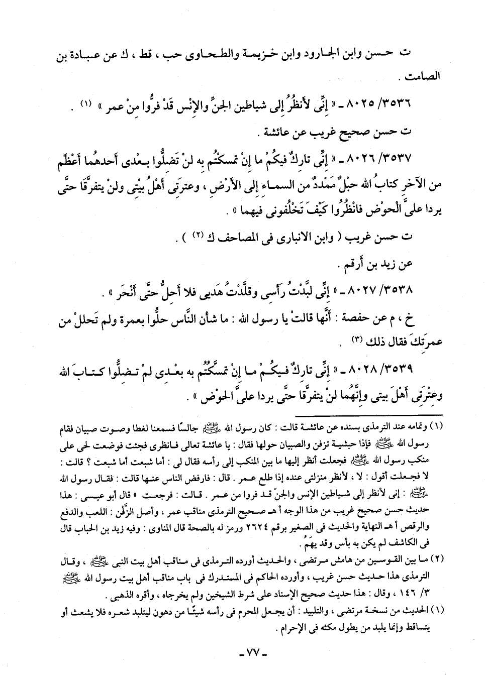 3539/ 8028 - "إِنِّى تارِكٌ فيكُمْ ما إِنْ تمسَّكُتُم به بعْدِى لمْ تضِلُّوا كتابَ اللَّه وعِتْرَتِى أَهْلَ بيتى وإِنَّهُما لنْ يتفرَّقا حتَّى يردا علىَّ الحوْض".