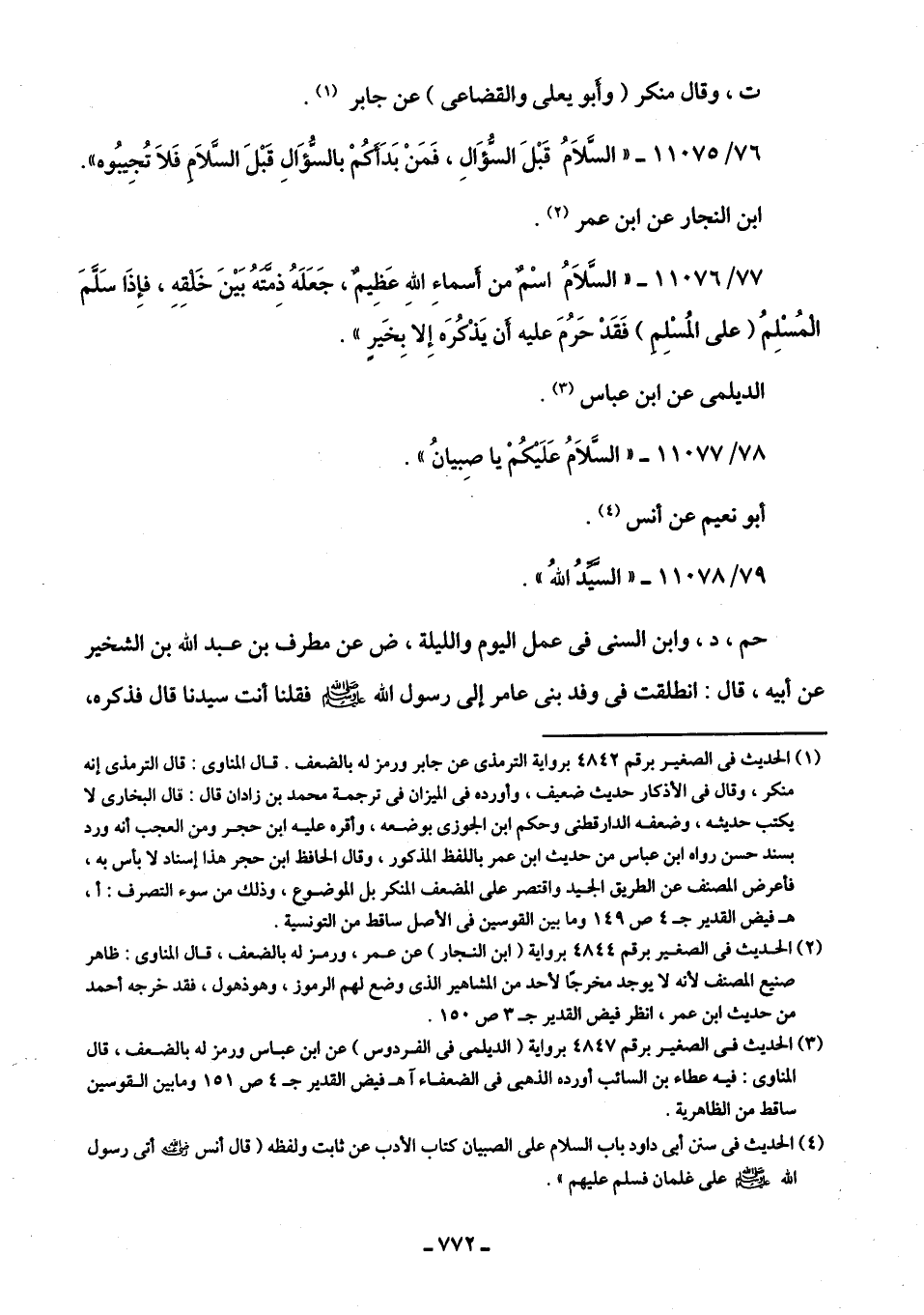 77/ 11076 - "السَّلامُ اسْمٌ من أَسماءِ اللهِ عَظِيمٌ، جَعَلَهُ ذِمَّتَهُ بَينَ خَلقِهِ، فإِذَا سَلَّمَ المُسْلِمُ (على المُسْلِمِ) فَقَدْ حَرُمَ عليه أَن يَذْكُرَه إِلا بِخَيرٍ".
