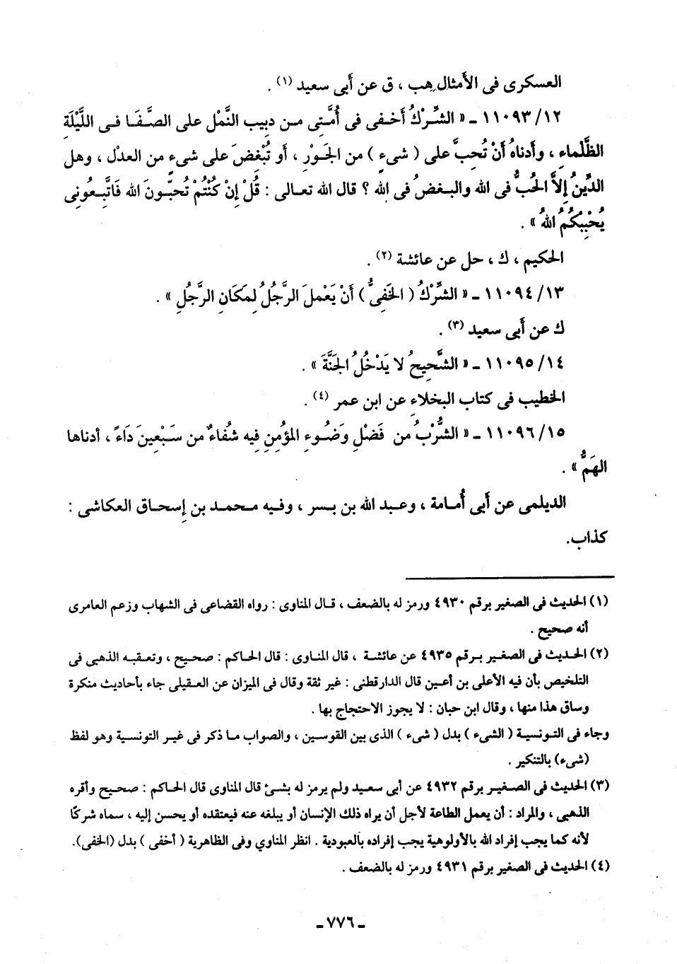 12/ 11093 - "الشِّرْكُ أخفى في أُمَّتِي من دبيب النَّمْل على الصَّفَا اللَّيلَةِ الظَّلْماءِ، وأدناهُ أنْ تُحِبَّ على (شيءٍ) من الجَوْرِ، أو تُبْغِضَ على شيءٍ من العدْل، وهل الدِّينُ إلَّا الحُبُّ في الله والبغضُ في الله؟ قال الله تعالى: قُلْ إِنْ كنتُمْ تُحبّونَ الله فَاتَّبعُونِى يُحْبِبْكمُ اللهُ".