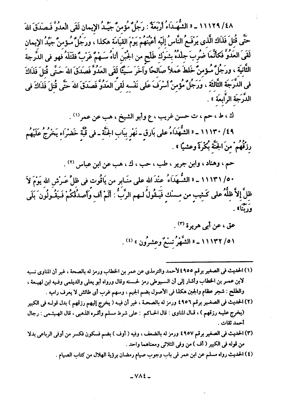 48/ 11129 - "الشُّهَدَاءُ أرْبَعَةٌ: رَجُلٌ مُؤمِنٌ جَيِّدُ الإِيمانِ لَقَى الْعدُوَّ فَصَدَقَ اللهَ حَتَّى قُتِلَ فَذَاك الَّذِي يَرْفَعُ النَّاسُ إِلَيهِ أعْيُنَهُم يَوْمَ القِيَامَةِ هكذا، ورَجُلٌ مُؤمنٌ جيِّدُ الإيمانِ لَقَى العَدُوَّ فَكأنَّما ضُرِبَ جِلْدُهُ بِشَوْكِ طَلحٍ من الْجُبْنِ أتاهُ سَهْمٌ غَرْبٌ فقَتَلَهُ فهو في الدَّرجة الثَّانِيَةِ، ورَجُلٌ مُؤمِنٌ خلطَ عَملًا صَالِحًا وآخَرَ سَيِّئًا لَقَى العَدُوَّ فَصَدَقَ اللهَ حَتَّى قُتِلَ فَذَاكَ في الدَّرَجَة الثَّالِثَةِ، وَرَجُلٌ مُؤمِنٌ أسْرَفَ عَلى نَفْسِهِ لَقِيَ العَدُوَّ فَصَدَقَ اللهَ حَتَّى قُتِلَ فَذَاكَ في الدَّرَجَةِ الرَّابِعَةِ".