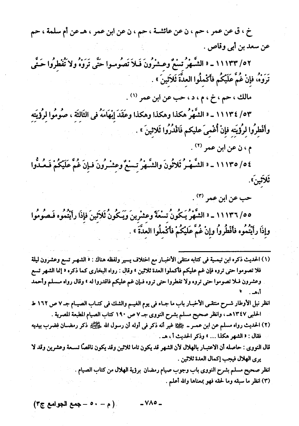 52/ 11133 - "الشَّهْرُ تسعٌ وعِشْرُونَ فَلَا تَصُوموا حَتَّى تَرَوْهُ ولا تُفْطِرُوا حَتَّى تَرَوْهُ، فإِنْ غُمَّ عَلَيكم فأَكْمِلُوا العِدَّةَ ثَلاثينَ".
