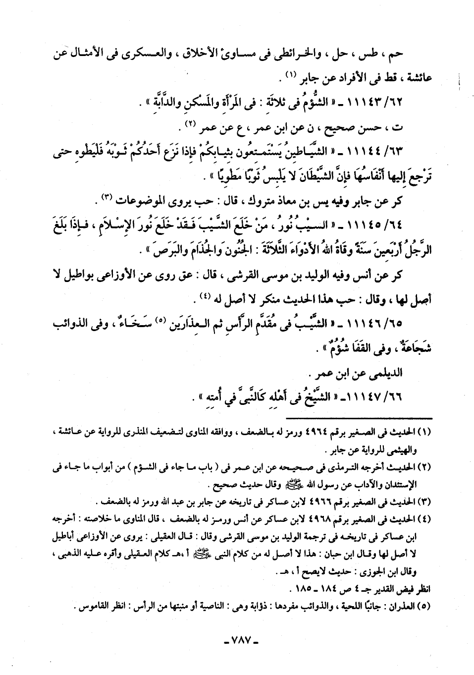 65/ 11146 - "الشَّيبُ في مُقَدَّمِ الرَّأسِ ثم العِذَارَين (¬5) سَخَاءٌ، وفي الذوائب شَجَاعَةٌ، وفي القَفَا شُؤُمٌ".