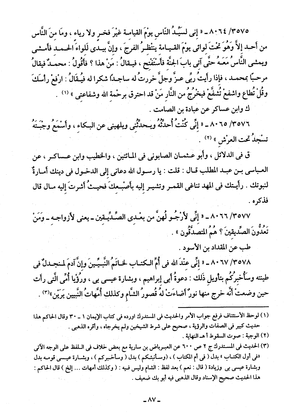 3578/ 8067 - "إِنّى عِنْدَ اللَّه في أُمِّ الكتاب لخاتَمُ النَّبيِّينَ وإِنَّ آدمَ لمنجدلٌ في طينته وسَأُخبِرُكُم بتأويلِ ذَلك: دعوةُ أبى إِبراهيم، وبشارة عيسى بى، ورُؤْيا أُمِّى الَّتى رأَت حين وضعتْ أَنَّه خرج منها نورٌ أَضاءَتْ لهُ قُصورُ الشَّامِ وكذلك أُمَّهاتُ النَّبيين يَرَيْن" (¬3).