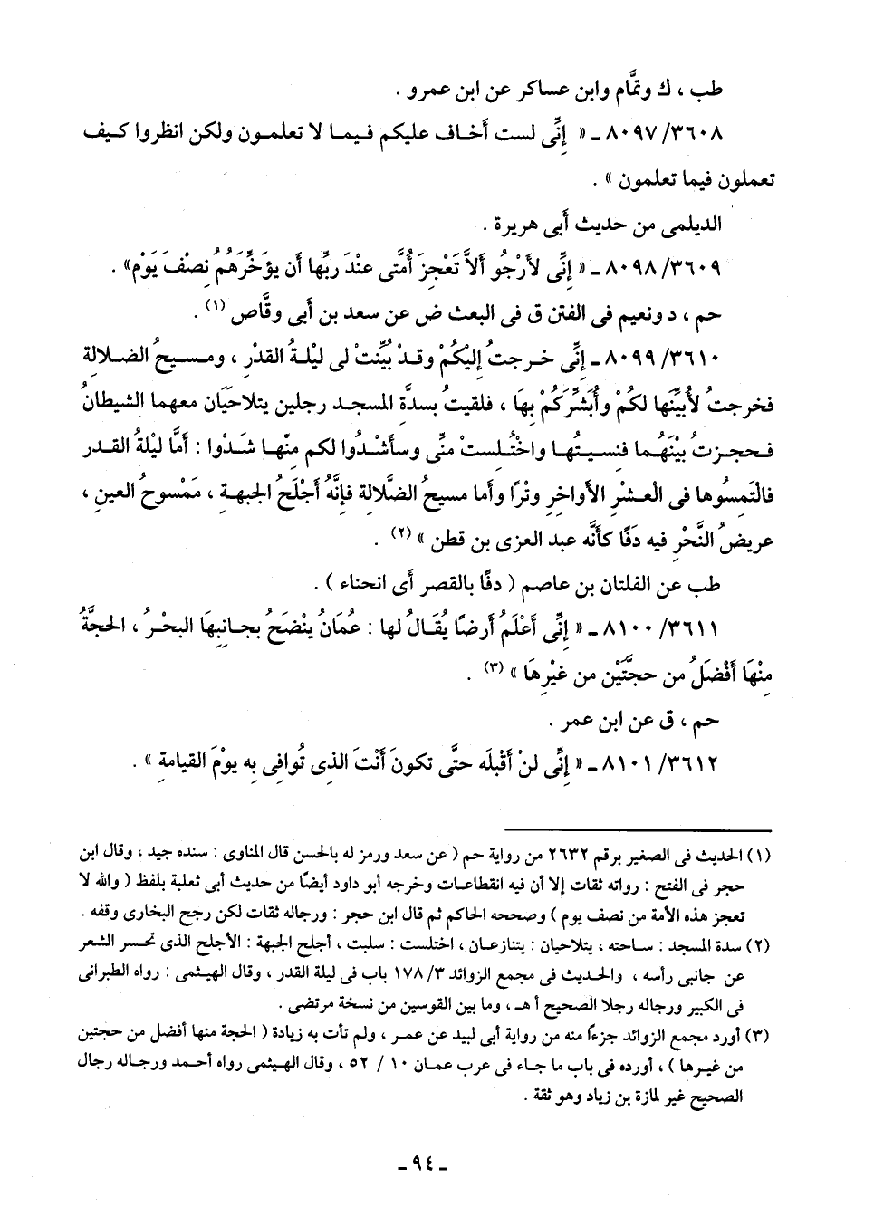 3611/ 8100 - "إِنِّى أَعْلَمُ أَرضًا يُقَالُ لها: عُمَانُ ينْضَحُ بجانِبهَا البحْرُ، الحجَّةُ مِنْهَا أَفْضَلُ من حجَّتَيْن من غيْرِهَا" (¬3).