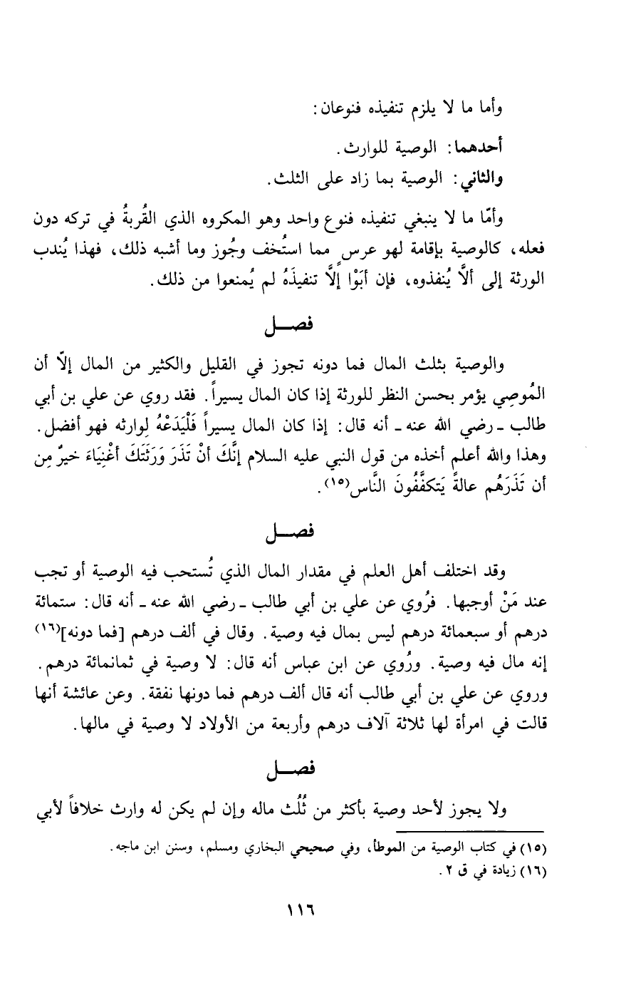 والوصية بثلث المال فما دونه تجوز في القليل والكثير من المال إلا أن الموصي يؤمر بحسن النظر للورثة إذا كان المال يسيرا. فقد روي عن علي بن أبي طالب - رَضِيَ اللَّهُ عَنْهُ - أنه قال: إذا كان المال يسيرا فليدعه لوارثه فهو أفضل. وهذا والله أعلم أخذه من قول النبي - عَلَيْهِ السَّلَامُ - «إنك أن تذر ورثتك أغنياء خير من أن تذرهم عالة يتكففون الناس».