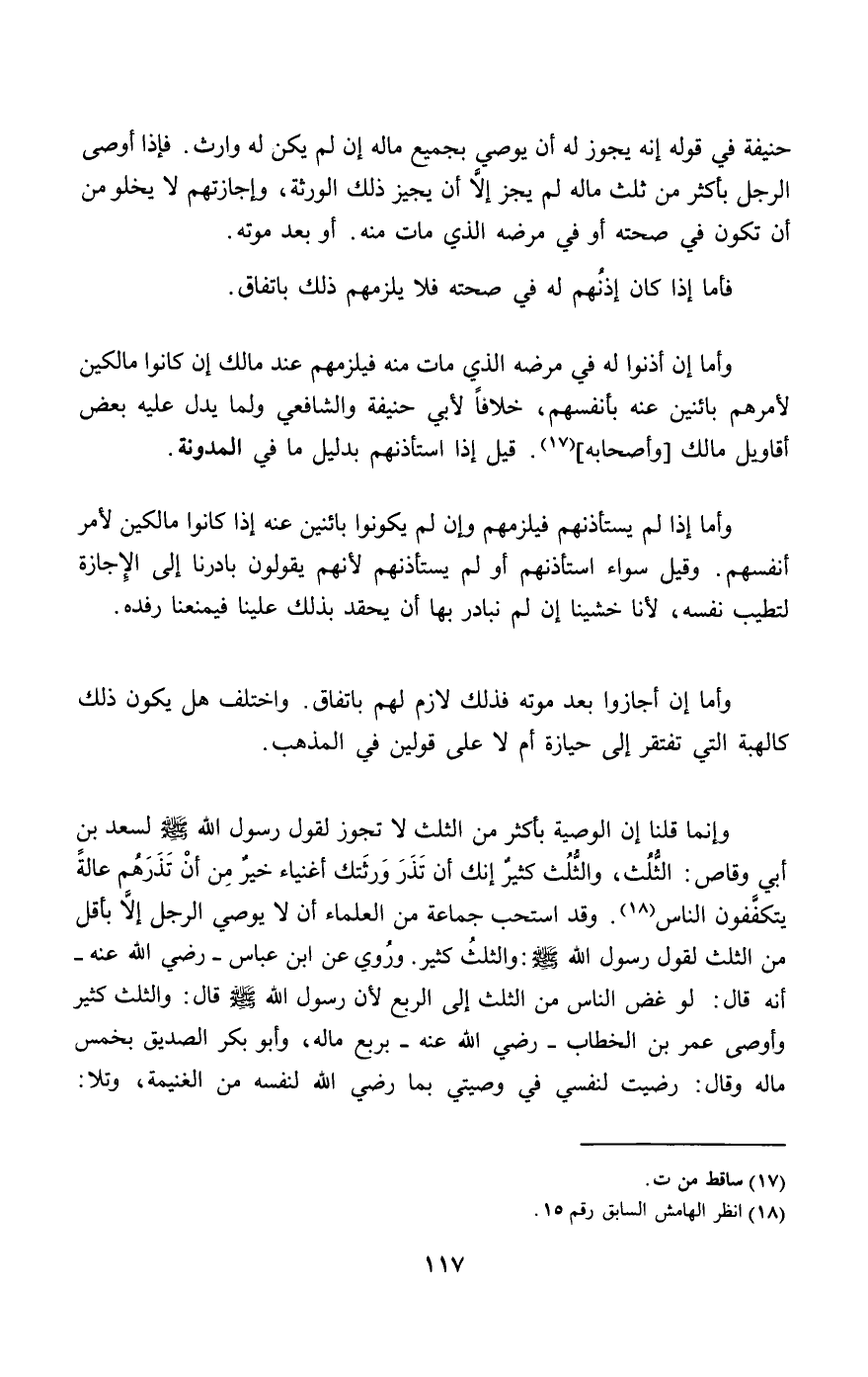 حنيفة في قوله إنه يجوز له أن يوصي بجميع ماله إن لم يكن له وارث. فإذا أوصى الرجل بأكثر من ثلث ماله لم يجز إلا أن يجيز ذلك الورثة، وإجازتهم لا يخلو من أن تكون في صحته أو في مرضه الذي مات منه. أو بعد موته.