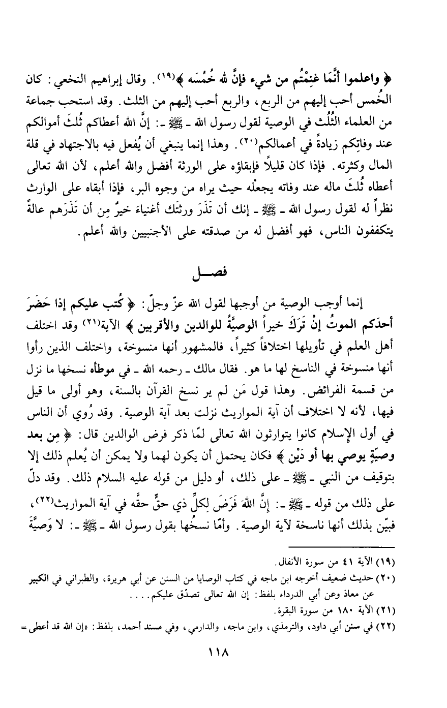 {وَاعْلَمُوا أَنَّمَا غَنِمْتُمْ مِنْ شَيْءٍ فَأَنَّ لِلَّهِ خُمُسَهُ} [الأنفال: 41]. وقال إبراهيم النخعي: كان الخمس أحب إليهم من الربع، والربع أحب إليهم من الثلث. وقد استحب جماعة من العلماء الثلث في الوصية لقول رسول الله- صَلَّى اللَّهُ عَلَيْهِ وَسَلَّمَ -: «إن الله أعطاكم ثلث أموالكم عند وفاتكم زيادة في أعمالكم». وهذا إنما ينبغي أن يفعل فيه بالاجتهاد في قلة المال وكثرته. فإذا كان قليلا فإبقاؤه على الورثة أفضل والله أعلم، لأن الله تعالى أعطاه ثلث ماله عند وفاته يجعله حيث يراه من وجوه البر، فإذا أبقاه على الوارث نظرا له لقول رسول الله- صَلَّى اللَّهُ عَلَيْهِ وَسَلَّمَ - «إنك أن تذر ورثتك أغنياء خير من أن تذرهم عالة يتكففون الناس»، فهو أفضل له من صدقته على الأجنبيين والله أعلم.