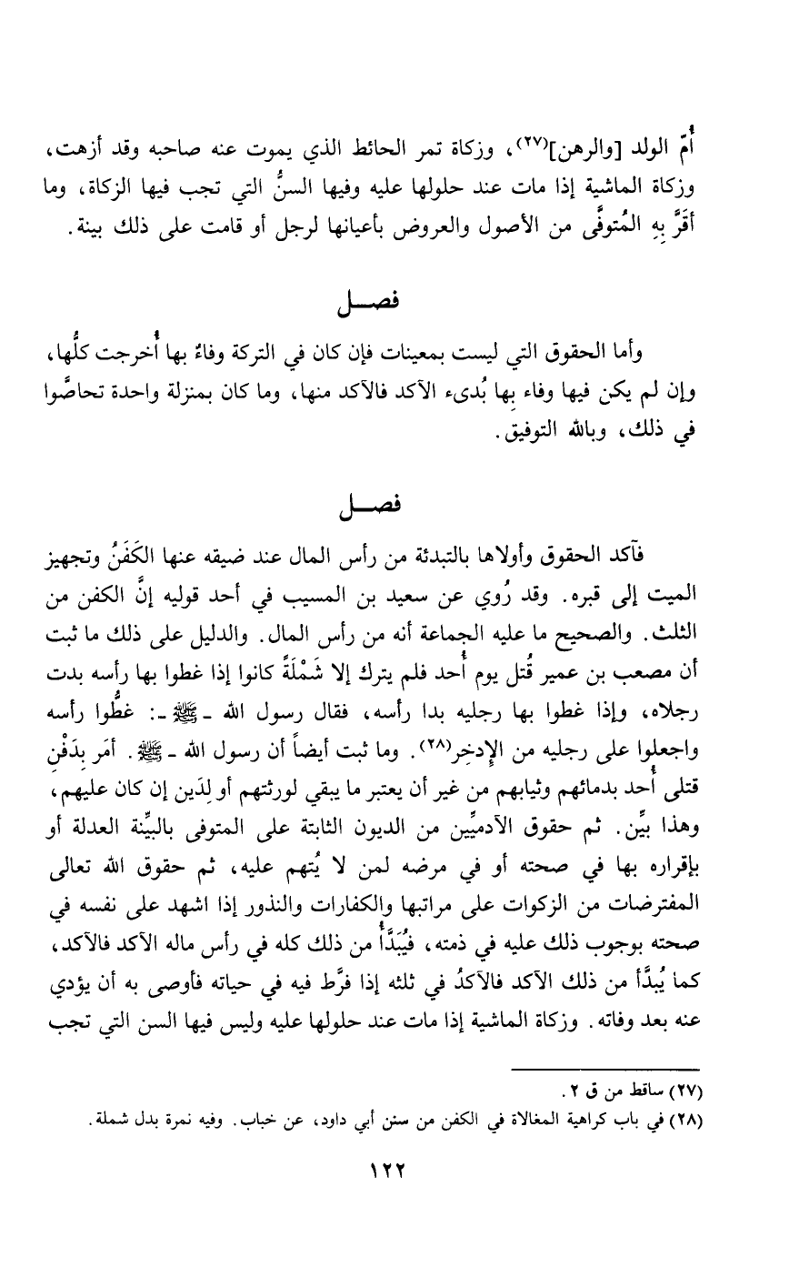 فآكد الحقوق وأولاها بالتبدئة من رأس المال عند ضيقه عنها الكفن وتجهيز الميت إلى قبره. وقد روي عن سعيد بن المسيب في أحد قوليه إن الكفن من الثلث. والصحيح ما عليه الجماعة أنه من رأس المال. والدليل على ذلك ما ثبت أن «مصعب بن عمير قتل يوم أحد فلم يترك إلا شملة كانوا إذا غطوا بها رأسه بدت رجلاه، وإذا غطوا بها رجليه بدا رأسه، فقال رسول الله - صَلَّى اللَّهُ عَلَيْهِ وَسَلَّمَ -: " غطوا رأسه واجعلوا على رجليه من الإدخر». وما ثبت أيضا «أن رسول الله- صَلَّى اللَّهُ عَلَيْهِ وَسَلَّمَ -. أمر بدفن قتلى أحد بدمائهم وثيابهم» من غير أن يعتبر ما يبقي لورثتهم أو لدين إن كان عليهم، وهذا بين. ثم حقوق الآدميين من الديون الثابتة على المتوفى بالبينة العدلة أو بإقراره بها في صحته أو في مرضه لمن لا يتهم عليه، ثم حقوق الله تعالى المفترضات من الزكوات على مراتبها والكفارات والنذور إذا اشهد على نفسه في صحته بوجوب ذلك عليه في ذمته، فيبدأ من ذلك كله في رأس ماله الآكد فالآكد، كما يبدأ من ذلك الآكد فالآكد في ثلثه إذا فرط فيه في حياته فأوصى به أن يؤدي عنه بعد وفاته. وزكاة الماشية إذا مات عند حلولها عليه وليس فيها السن التي تجب