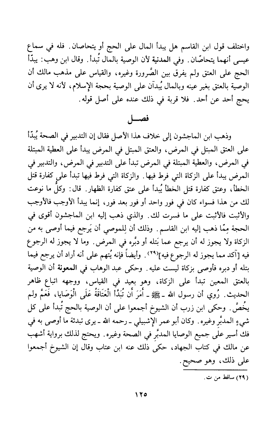 وذهب ابن الماجشون إلى خلاف هذا الأصل فقال إن التدبير في الصحة يبدأ على العتق المبتل في المرض، والعتق المبتل في المرض يبدأ على العطية المبتلة في المرض، والعطية المبتلة في المرض تبدأ على التدبير في المرض، والتدبير في المرض يبدأ على الزكاة التي فرط فيها. والزكاة التي فرط فيها تبدأ على كفارة قتل الخطأ، وعتق كفارة قتل الخطأ يبدأ على عتق كفارة الظهار. قال: وكل ما نوعت لك من هذا فسواء كان في فور واحد أو فور بعد فور، إنما يبدأ الأوجب فالأوجب والأثبت فالأثبت على ما فسرت لك. والذي ذهب إليه ابن الماجشون أقوى في الحجة مما ذهب إليه ابن القاسم. وذلك أن للموصي أن يرجع فيما أوصى به من الزكاة ولا يجوز له أن يرجع عما بتله أو دبره في المرض. وما لا يجوز له الرجوع فيه. وأيضا فإنه يتهم على أنه أراد أن يرجع فيما بتله أو دبره فأوصى بزكاة ليست عليه. وحكى عبد الوهاب في المعونة أن الوصية بالعتق المعين تبدأ على الزكاة، وهو بعيد في القياس، ووجهه اتباع ظاهر الحديث. روي أن رسول الله- صَلَّى اللَّهُ عَلَيْهِ وَسَلَّمَ - «أمر أن تبدأ العتاقة على الوصايا، فعم ولم يخص». وحكى ابن زرب أن الشيوخ أجمعوا على أن الوصية بالحج تبدأ على كل شيء المدبر وغيره. وكان أبو عمر الإشبيلي - رَحِمَهُ اللَّهُ - يرى تبدئة ما أوصى به في فك أسير على جميع الوصايا المدبر في الصحة وغيره. ويحتج لذلك برواية أشهب عن مالك في كتاب الجهاد، حكى ذلك عنه ابن عتاب وقال إن الشيوخ أجمعوا على ذلك، وهو صحيح.