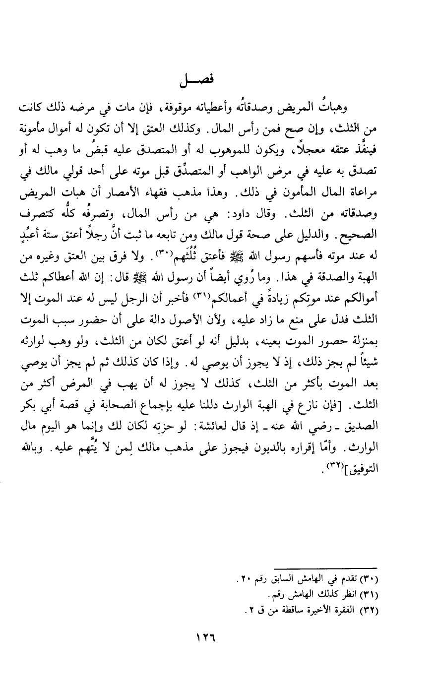 وهبات المريض وصدقاته وأعطياته موقوفة، فإن مات في مرضه ذلك كانت من الثلث، وإن صح فمن رأس المال. وكذلك العتق إلا أن تكون له أموال مأمونة فينفذ عتقه معجلا، ويكون للموهوب له أو المتصدق عليه قبض ما وهب له أو تصدق به عليه في مرض الواهب أو المتصدق قبل موته على أحد قولي مالك في مراعاة المال المأمون في ذلك. وهذا مذهب فقهاء الأمصار أن هبات المريض وصدقاته من الثلث. وقال داود: هي من رأس المال، وتصرفه كله كتصرف الصحيح. والدليل على صحة قول مالك ومن تابعه ما ثبت أن «رجلا أعتق ستة أعبد له عند موته فأسهم رسول الله - صَلَّى اللَّهُ عَلَيْهِ وَسَلَّمَ - فأعتق ثلثهم». ولا فرق بين العتق وغيره من الهبة والصدقة في هذا. وما روي أيضا أن رسول الله - صَلَّى اللَّهُ عَلَيْهِ وَسَلَّمَ - قال: «إن الله أعطاكم ثلث أموالكم عند موتكم زيادة في أعمالكم» فأخبر أن الرجل ليس له عند الموت إلا الثلث فدل على منع ما زاد عليه، ولأن الأصول دالة على أن حضور سبب الموت بمنزلة حضور الموت بعينه، بدليل أنه لو أعتق لكان من الثلث، ولو وهب لوارثه شيئا لم يجز ذلك، إذ لا يجوز أن يوصي له. وإذا كان كذلك ثم لم يجز أن يوصي بعد الموت بأكثر من الثلث، كذلك لا يجوز له أن يهب في المرض أكثر من الثلث. .