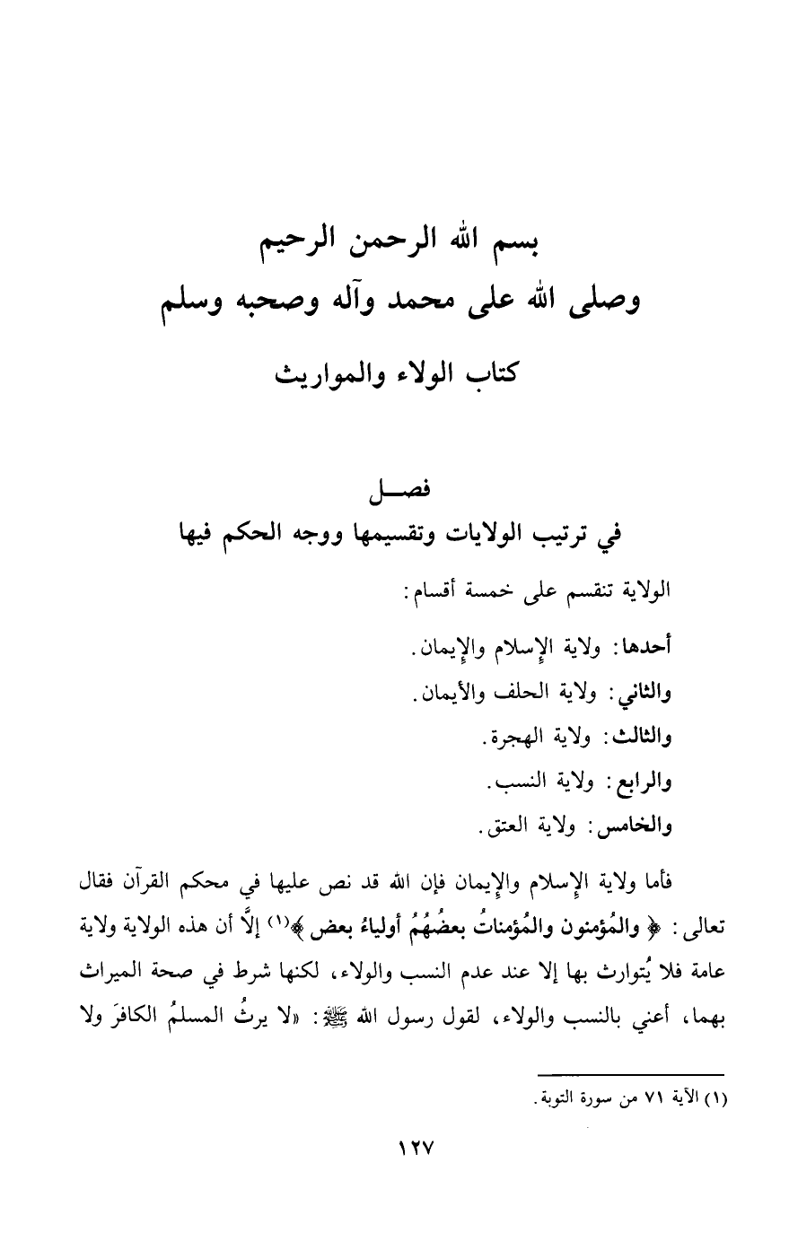 فأما ولاية الإسلام والإيمان فإن الله قد نص عليها في محكم القرآن فقال تعالى: {وَالْمُؤْمِنُونَ وَالْمُؤْمِنَاتُ بَعْضُهُمْ أَوْلِيَاءُ بَعْضٍ} [التوبة: 71] إلا أن هذه الولاية ولاية عامة فلا يتوارث بها إلا عند عدم النسب والولاء، لكنها شرط في صحة الميراث بهما، أعني بالنسب والولاء، لقول رسول الله - صَلَّى اللَّهُ عَلَيْهِ وَسَلَّمَ -: «لا يرث المسلم الكافر ولا