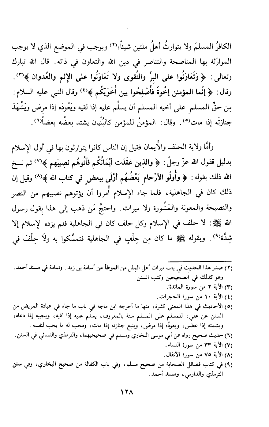 الكافر المسلم ولا يتوارث أهل ملتين شيئا» ويوجب في الموضع الذي لا يوجب الموارثة بها المناصحة والتناصر في دين الله والتعاون في ذاته. قال الله تبارك وتعالى: {وَتَعَاوَنُوا عَلَى الْبِرِّ وَالتَّقْوَى وَلا تَعَاوَنُوا عَلَى الإِثْمِ وَالْعُدْوَانِ} [المائدة: 2] وَقَالَ {إِنَّمَا الْمُؤْمِنُونَ إِخْوَةٌ فَأَصْلِحُوا بَيْنَ أَخَوَيْكُمْ} [الحجرات: 10] وقال النبي - عَلَيْهِ السَّلَامُ -: «من حق المسلم على أخيه المسلم أن يسلم عليه إذا لقيه ويعوده إذا مرض ويشهد جنازته إذا مات». وقال: «المؤمن للمؤمن كالبنيان يشد بعضه بعضا».