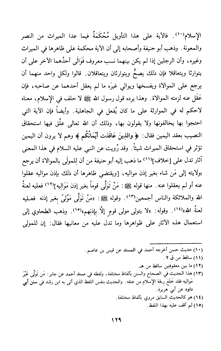 الإسلام». فالآية على هذا التأويل محكمة فيما عدا الميراث من النصر والمعونة. وذهب أبو حنيفة وأصحابه إلى أن الآية محكمة على ظاهرها في الميراث وغيره، وأن الرجلين إذا لم يكن بينهما نسب معروف فوالى أحدهما الآخر على أن يتوارثا ويتعاقلا فإن ذلك يصح ويتوارثان ويتعاقلان. قالوا ولكل واحد منهما أن يرجع على الموالاة ويفسخها ويوالي غيره ما لم يعقل أحدهما عن صاحبه، فإن عقل عنه لزمته الموالاة. وهذا يرده قول رسول الله - صَلَّى اللَّهُ عَلَيْهِ وَسَلَّمَ -: «لا حلف في الإسلام» معناه لا حكم له في الموارثة على ما كان يفعل في الجاهلية. وأيضا فإن الآية التي احتجوا بها يخالفونها ولا يقولون بها، وذلك أن الله تعالى علق فيها استحقاق النصيب بعقد اليمين فقال: {وَالَّذِينَ عَقَدَتْ أَيْمَانُكُمْ} [النساء: 33] وهم لا يرون أن اليمين تؤثر في استحقاق الميراث شيئا. وقد رويت عن النبي - عَلَيْهِ السَّلَامُ - في هذا المعنى آثار تدل على ما ذهب إليه أبو حنيفة من أن للمولى بالموالاة أن يرجع بولايته إلى من شاء بغير إذن مواليه، فعليه لعنة الله والملائكة والناس أجمعين.
