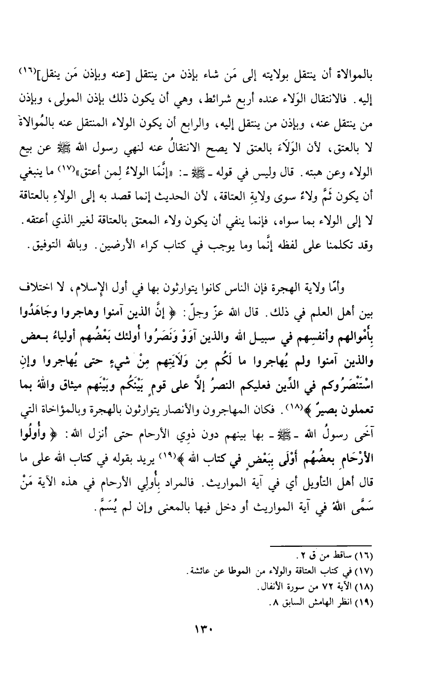 وأما ولاية الهجرة فإن الناس كانوا يتوارثون بها في أول الإسلام، لا اختلاف بين أهل العلم في ذلك. قال الله عز وجل: {إِنَّ الَّذِينَ آمَنُوا وَهَاجَرُوا وَجَاهَدُوا بِأَمْوَالِهِمْ وَأَنْفُسِهِمْ فِي سَبِيلِ اللَّهِ وَالَّذِينَ آوَوْا وَنَصَرُوا أُولَئِكَ بَعْضُهُمْ أَوْلِيَاءُ بَعْضٍ وَالَّذِينَ آمَنُوا وَلَمْ يُهَاجِرُوا مَا لَكُمْ مِنْ وَلايَتِهِمْ مِنْ شَيْءٍ حَتَّى يُهَاجِرُوا وَإِنِ اسْتَنْصَرُوكُمْ فِي الدِّينِ فَعَلَيْكُمُ النَّصْرُ إِلا عَلَى قَوْمٍ بَيْنَكُمْ وَبَيْنَهُمْ مِيثَاقٌ وَاللَّهُ بِمَا تَعْمَلُونَ بَصِيرٌ} [الأنفال: 72]. فكان المهاجرون والأنصار يتوارثون بالهجرة وبالمؤاخاة التي آخى رسول الله- صَلَّى اللَّهُ عَلَيْهِ وَسَلَّمَ - بها بينهم دون ذوي الأرحام حتى أنزل الله: {وَأُولُو الأَرْحَامِ بَعْضُهُمْ أَوْلَى بِبَعْضٍ فِي كِتَابِ اللَّهِ} [الأنفال: 75] يريد بقوله في كتاب الله على ما قال أهل التأويل أي في آية المواريث. فالمراد بأولي الأرحام في هذه الآية من سمى الله في آية المواريث أو دخل فيها بالمعنى وإن لم يسم.