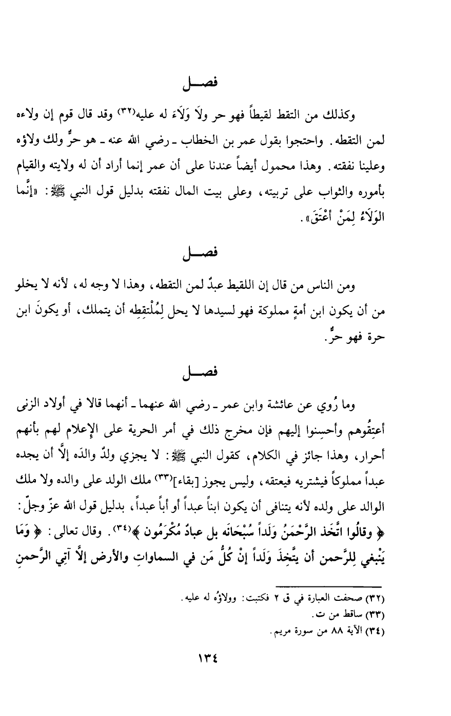 وما روي عن عائشة وابن عمر - رَضِيَ اللَّهُ عَنْهُمَا - أنهما قالا في أولاد الزنى: أعتقوهم وأحسنوا إليهم. فإن مخرج ذلك في أمر الحرية على الإعلام لهم بأنهم أحرار، وهذا جائز في الكلام، كقول النبي - صَلَّى اللَّهُ عَلَيْهِ وَسَلَّمَ -: «لا يجزي ولد والده إلا أن يجده عبدا مملوكا فيشتريه فيعتقه» وليس يجوز بقاء] ملك الولد على والده ولا ملك الوالد على ولده لأنه يتنافى أن يكون ابنا عبدا أو أبا عبدا، بدليل قول الله عز وجل: {وَقَالُوا اتَّخَذَ الرَّحْمَنُ وَلَدًا سُبْحَانَهُ بَلْ عِبَادٌ مُكْرَمُونَ} [الأنبياء: 26]. وقال تعالى: {وَمَا يَنْبَغِي لِلرَّحْمَنِ أَنْ يَتَّخِذَ وَلَدًا} [مريم: 92] {إِنْ كُلُّ مَنْ فِي السَّمَاوَاتِ وَالأَرْضِ إِلا آتِي الرَّحْمَنِ عَبْدًا} [مريم: 93]