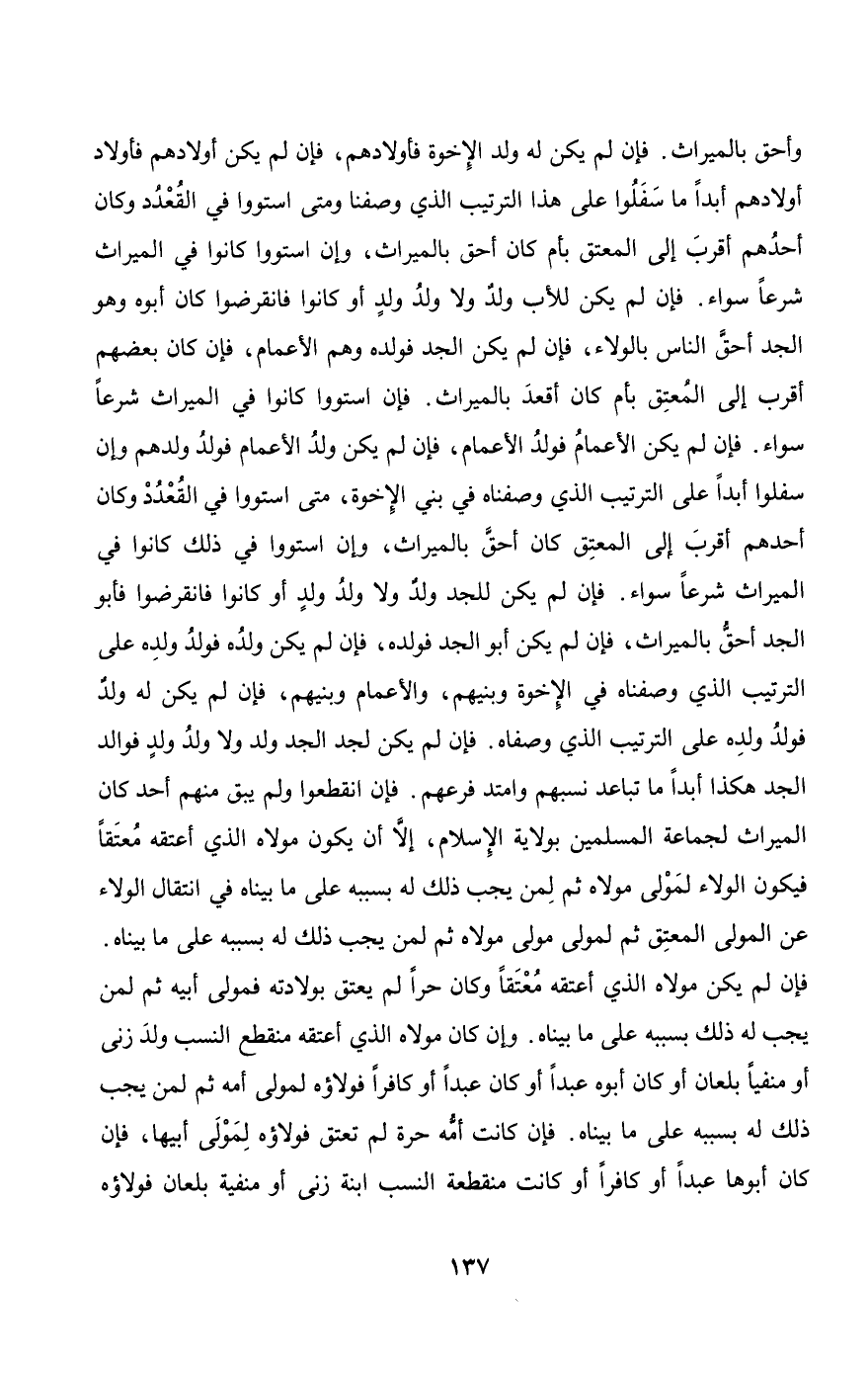 وأحق بالميراث. فإن لم يكن له ولد الإخوة فأولادهم، فإن لم يكن أولادهم فأولاد أولادهم أبدا ما سفلوا على هذا الترتيب الذي وصفنا ومتى استووا في القعدد وكان أحدهم أقرب إلى المعتق بأم كان أحق بالميراث، وإن استووا كانوا في الميراث شرعا سواء. فإن لم يكن للأب ولد ولا ولد ولد أو كانوا فانقرضوا كان أبوه وهو الجد أحق الناس بالولاء، فإن لم يكن الجد فولده وهم الأعمام، فإن كان بعضهم أقرب إلى المعتق بأم كان أقعد بالميراث. فإن استووا كانوا في الميراث شرعا سواء. فإن لم يكن الأعمام فولد الأعمام، فإن لم يكن ولد الأعمام فولد ولدهم وإن سفلوا أبدا على الترتيب الذي وصفناه في بني الإخوة، متى استووا في القعدد وكان أحدهم أقرب إلى المعتق كان أحق بالميراث، وإن استووا في ذلك كانوا في الميراث شرعا سواء. فإن لم يكن للجد ولد ولا ولد ولد، أو كانوا فانقرضوا فأبو الجد أحق بالميراث، فإن لم يكن أبو الجد فولده، فإن لم يكن ولده فولد ولده على الترتيب الذي وصفناه في الإخوة وبنيهم، والأعمام وبنيهم، فإن لم يكن له ولد فولد ولده على الترتيب الذي وصفاه. فإن لم يكن لجد الجد ولد ولا ولد ولد فوالد الجد هكذا أبدا ما تباعد نسبهم وامتد فرعهم. فإن انقطعوا ولم يبق منهم أحد كان الميراث لجماعة المسلمين بولاية الإسلام، إلا أن يكون مولاه الذي أعتقه معتقا فيكون الولاء لمولى مولاه ثم لمن يجب ذلك له بسببه على ما بيناه في انتقال الولاء عن المولى المعتق ثم لمولى مولى مولاه ثم لمن يجب ذلك له بسببه على ما بيناه. فإن لم يكن مولاه الذي أعتقه معتقا وكان حرا لم يعتق بولادته فمولى أبيه ثم لمن يجب له ذلك بسببه على ما بيناه. وإن كان مولاه الذي أعتقه منقطع النسب ولد زنى أو منفيا بلعان أو كان أبوه عبدا أو كان عبدا أو كافرا فولاؤه لمولى أمه ثم لمن يجب ذلك له بسببه على ما بيناه. فإن كانت أمه حرة لم تعتق فولاؤه لمولى أبيها، فإن كان أبوها عبدا أو كافرا أو كانت منقطعة النسب ابنة زنى أو منفية بلعان فولاؤه