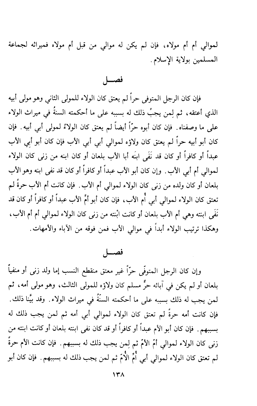فإن كان الرجل المتوفى حرا لم يعتق كان الولاء للمولى الثاني وهو مولى أبيه الذي أعتقه، ثم لمن يجب ذلك له بسببه على ما أحكمته السنة في ميراث الولاء على ما وصفناه. فإن كان أبوه حرا أيضا لم يعتق كان الولاء لمولى أبي أبيه. فإن كان أبو أبيه حرا لم يعتق كان ولاؤه لموالي أبي أبي الأب فإن كان أبو أبي الأب عبدا أو كافرا أو كان قد نفى ابنه أبا الأب بلعان أو كان ابنه من زنى كان الولاء لموالي أم أبي الأب. وإن كان أبو الأب عبدا أو كافرا أو كان قد نفى ابنه وهو الأب بلعان أو كان ولده من زنى كان الولاء لموالي أم الأب. فإن كانت أم الأب حرة لم تعتق كان الولاء لموالي أبي أم الأب، فإن كان أبو أم الأب عبدا أو كافرا أو كان قد نفى ابنته وهي أم الأب بلعان أو كانت ابنته من زنى كان الولاء لموالي أم أم الأب، وهكذا ترتيب الولاء أبدا في موالي الأب فمن فوقه من الآباء والأمهات.