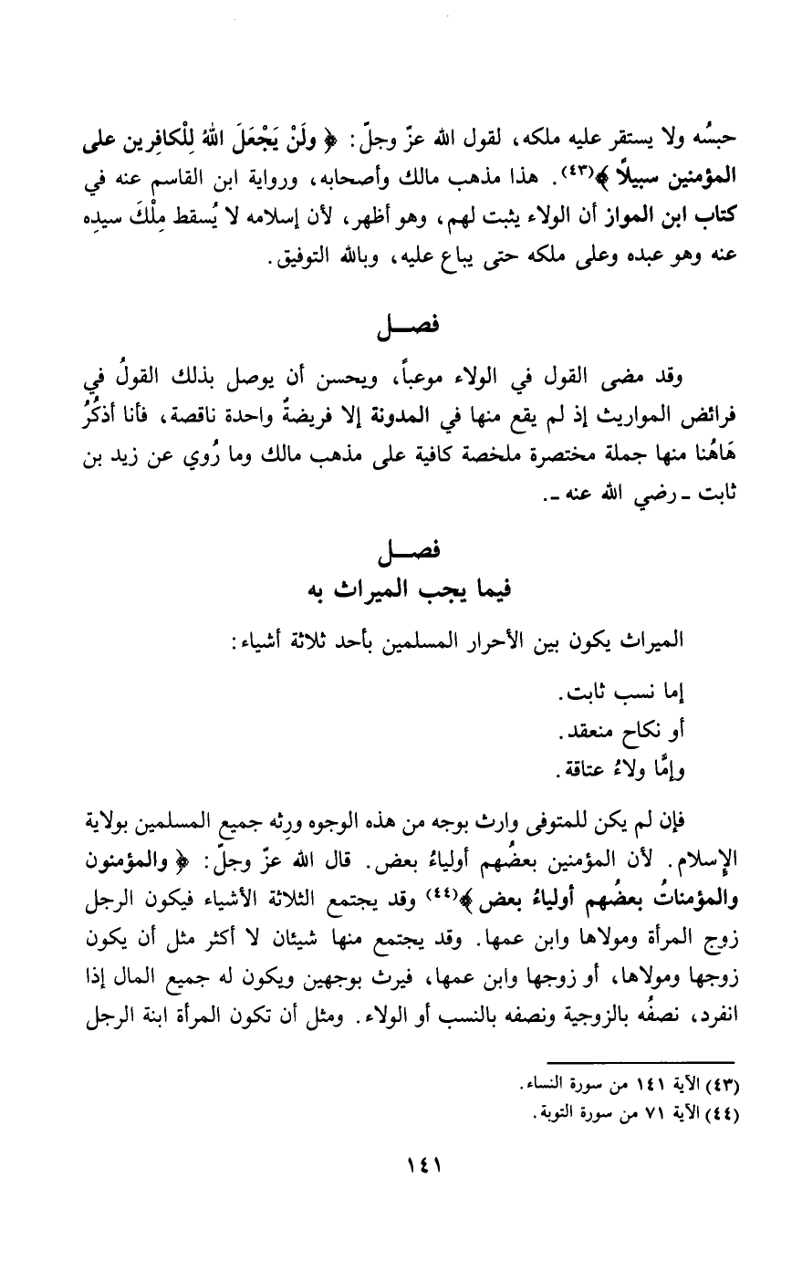 فإن لم يكن للمتوفى وارث بوجه من هذه الوجوه ورثه جميع المسلمين بولاية الإسلام. لأن المؤمنين بعضهم أولياء بعض. قال الله عز وجل: {وَالْمُؤْمِنُونَ وَالْمُؤْمِنَاتُ بَعْضُهُمْ أَوْلِيَاءُ بَعْضٍ} [التوبة: 71] وقد يجتمع الثلاثة الأشياء فيكون الرجل زوج المرأة ومولاها وابن عمها. وقد يجتمع منها شيئان لا أكثر مثل أن يكون زوجها ومولاها، أو زوجها وابن عمها، فيرث بوجهين ويكون له جميع المال إذا انفرد، نصفه بالزوجية ونصفه بالنسب أو الولاء. ومثل أن تكون المرأة ابنة الرجل