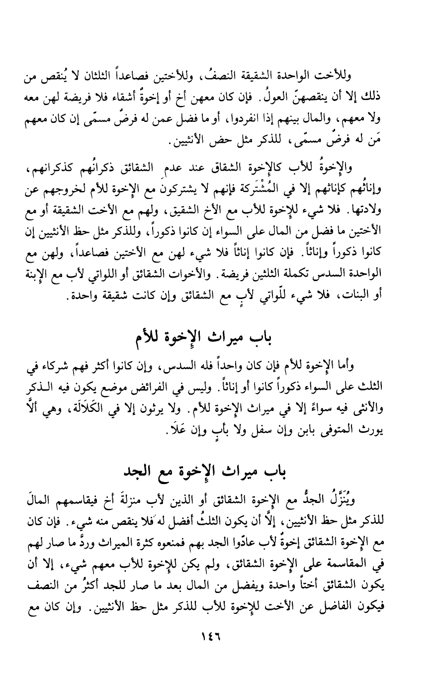 والإخوة للأب كالإخوة الشقاق عند عدم الشقائق ذكرانهم كذكرانهم، وإناثهم كإناثهم إلا في المشتركة فإنهم لا يشتركون مع الإخوة للأم لخروجهم عن ولادتها. فلا شيء للإخوة للأب مع الأخ الشقيق، ولهم مع الأخت الشقيقة أو مع الأختين ما فضل من المال على السواء إن كانوا ذكورا، وللذكر مثل حظ الأنثيين إن كانوا ذكورا وإناثا. فإن كانوا إناثا فلا شيء لهن مع الأختين فصاعدا، ولهن مع الواحدة السدس تكملة الثلثين فريضة. والأخوات الشقائق أو اللواتي لأب مع الابنة أو البنات، فلا شيء للواتي لأب مع الشقائق وإن كانت شقيقة واحدة.