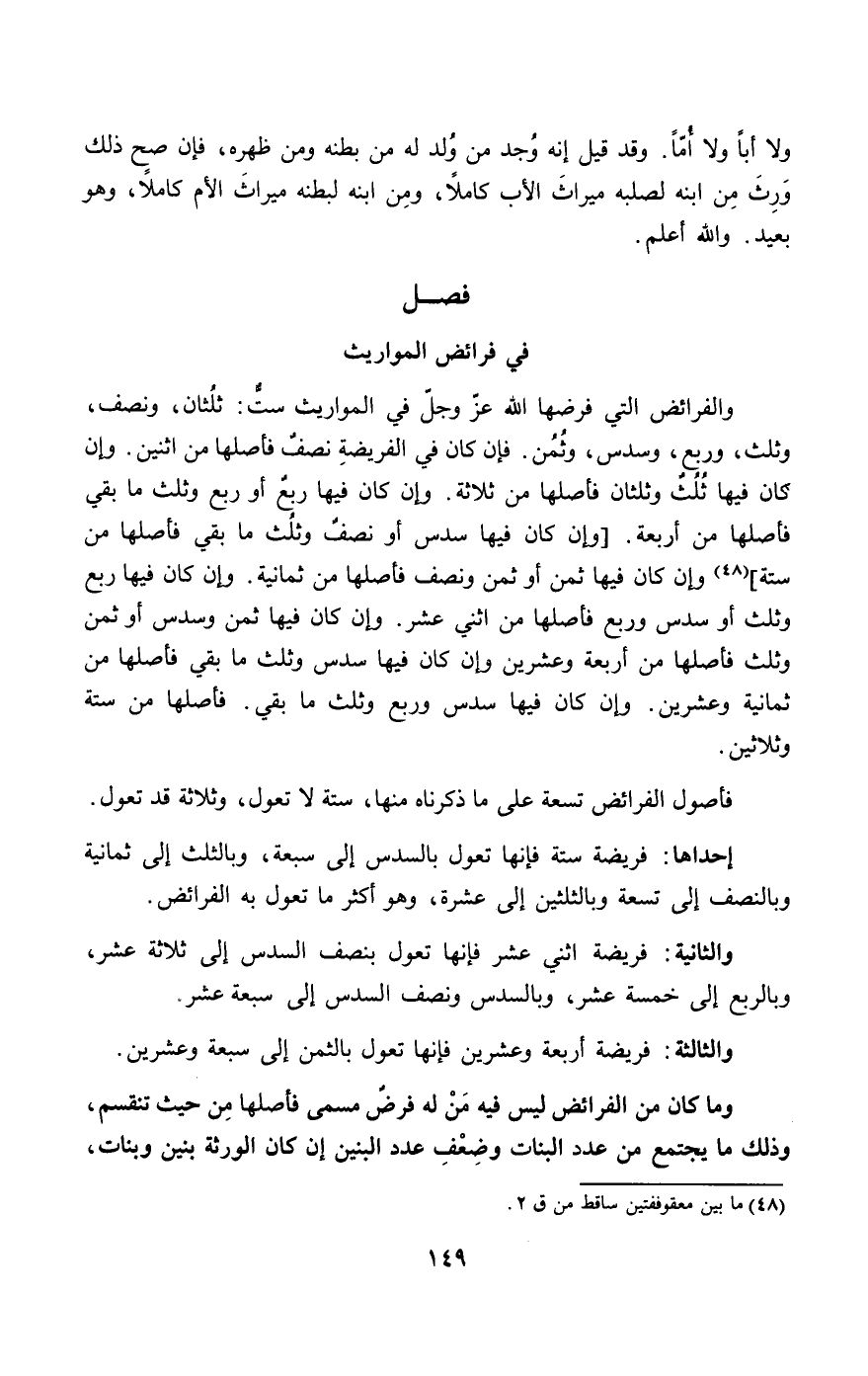 والفرائض التي فرضها الله عز وجل في المواريث ست: ثلثان، ونصف، وثلث، وربع، وسدس، وثمن. فإن كان في الفريضة نصف فأصلها من اثنين. وإن كان فيها ثلث وثلثان فأصلها من ثلاثة. وإن كان فيها ربع أو ربع وثلث ما بقي فأصلها من أربعة.، وإن كان فيها ثمن أو ثمن ونصف فأصلها من ثمانية. وإن كان فيها ربع وثلث أو سدس وربع فأصلها من اثني عشر. وإن كان فيها ثمن وسدس أو ثمن وثلث فأصلها من أربعة وعشرين وإن كان فيها سدس وثلث ما بقي فأصلها من ثمانية وعشرين. وإن كان فيها سدس وربع وثلث ما بقي. فأصلها من ستة وثلاثين.