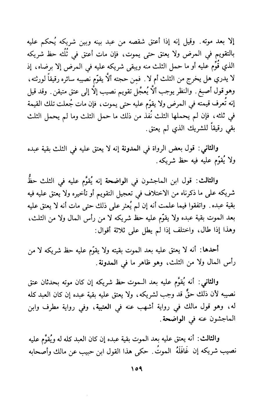 والثالث: أنه يعتق عليه بعد الموت بقية عبده إن كان العبد كله له ويقوم عليه نصيب شريكه إن غافلة الموت. حكى هذا القول ابن حبيب عن مالك وأصحابه