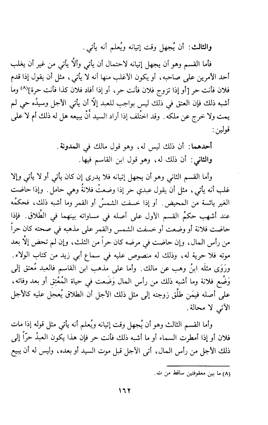 فأما القسم وهو أن يجهل إتيانه لاحتمال أن يأتي وألا يأتي من غير أن يغلب أحد الأمرين على صاحبه، أو يكون الأغلب منها أنه لا يأتي، مثل أن يقول: إذا قدم فلان فأنت حر وما أشبه ذلك فإن العتق في ذلك ليس بواجب للعبد إلا أن يأتي الأجل وسيده حي لم يمت ولا خرج عن ملكه. وقد اختلف إذا أراد السيد أن يبيعه هل له ذلك أم لا على قولين:
