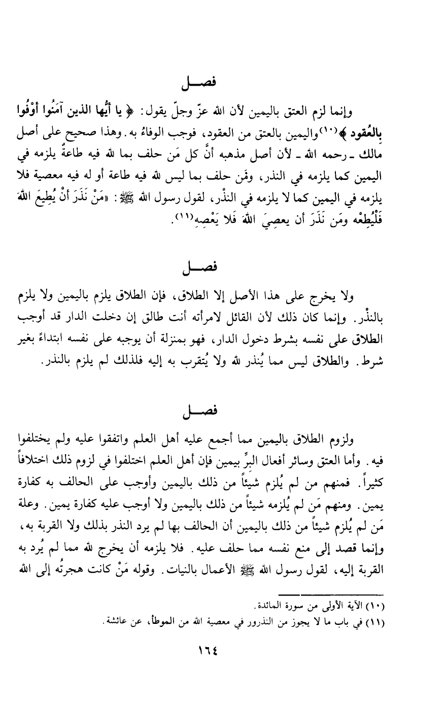 ولزوم الطلاق باليمين مما أجمع عليه أهل العلم واتفقوا عليه ولم يختلفوا فيه. وأما العتق وسائر أفعال البر بيمين فإن أهل العلم اختلفوا في لزوم ذلك اختلافا كثيرا. فمنهم من لم يلزم شيئا من ذلك باليمين وأوجب على الحالف به كفارة يمين. ومنهم من لم يلزمه شيئا من ذلك باليمين ولا أوجب عليه كفارة يمين. وعلة من لم يلزم شيئا من ذلك باليمين أن الحالف بها لم يرد النذر بذلك ولا القربة به، وإنما قصد إلى منع نفسه مما حلف عليه. فلا يلزمه أن يخرج لله مما لم يرد به القربة إليه، لقول رسول الله - صَلَّى اللَّهُ عَلَيْهِ وَسَلَّمَ -: «الأعمال بالنيات». وقوله: «من كانت هجرته إلى الله