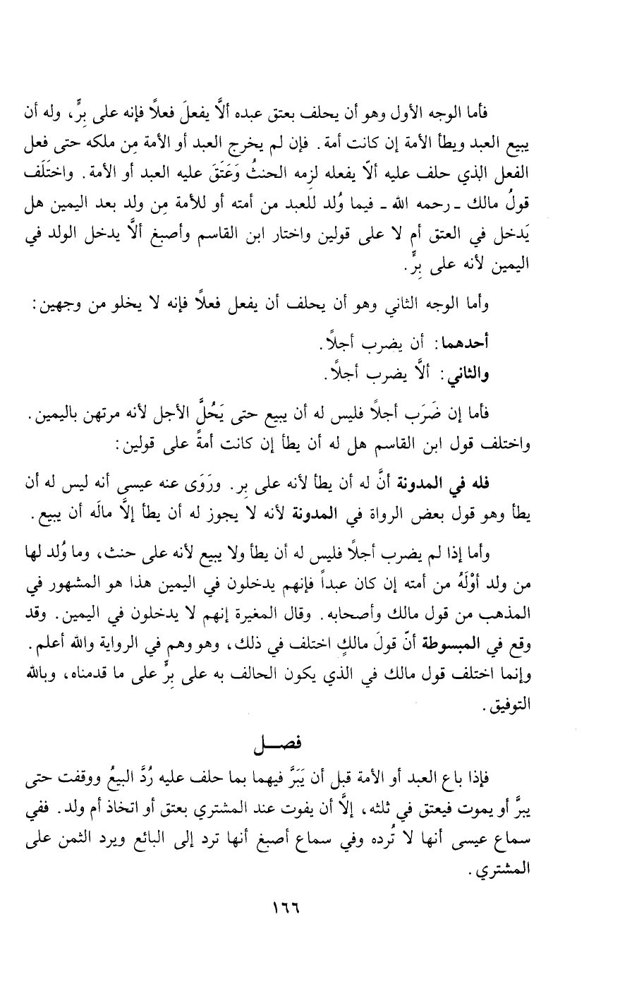 فأما الوجه الأول وهو أن يحلف بعتق عبده ألا يفعل فعلا فإنه على بر، وله أن يبيع العبد ويطأ الأمة إن كانت أمة. فإن لم يخرج العبد أو الأمة من ملكه حتى فعل الفعل الذي حلف عليه ألا يفعله لزمه الحنث وعتق عليه العبد أو الأمة. واختلف قول مالك - رَحِمَهُ اللَّهُ - فيما ولد للعبد من أمته أو للأمة من ولد بعد اليمين هل يدخل في العتق أم لا على قولين واختار ابن القاسم وأصبغ ألا يدخل الولد في اليمين لأنه على بر.