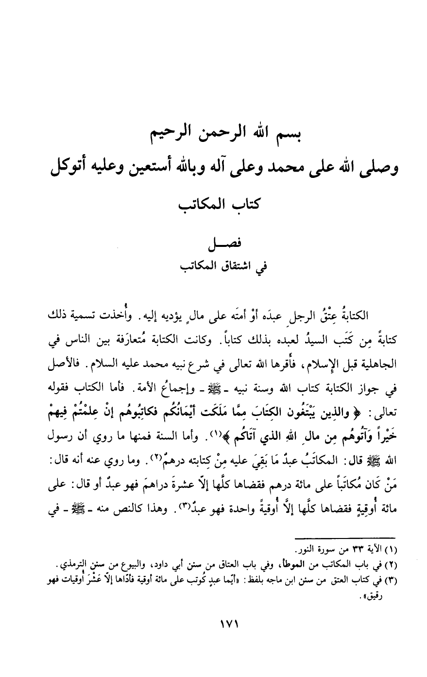 الكتابة عتق الرجل عبده أو أمته على مال يؤديه إليه. وأخذت تسمية ذلك كتابةً من كتب السيد لعبده بذلك كتابا. وكانت الكتابة متعارفة بين الناس في الجاهلية قبل الإسلام، فأقرها الله تعالى في شرع نبيه محمد - عَلَيْهِ السَّلَامُ -. فالأصل في جواز الكتابة كتاب الله وسنة نبيه- صَلَّى اللَّهُ عَلَيْهِ وَسَلَّمَ - وإجماع الأمة. فأما الكتاب فقوله تعالى: {وَالَّذِينَ يَبْتَغُونَ الْكِتَابَ مِمَّا مَلَكَتْ أَيْمَانُكُمْ فَكَاتِبُوهُمْ إِنْ عَلِمْتُمْ فِيهِمْ خَيْرًا وَآتُوهُمْ مِنْ مَالِ اللَّهِ الَّذِي آتَاكُمْ} [النور: 33]. وأما السنة فمنها ما روي أن رسول الله - صَلَّى اللَّهُ عَلَيْهِ وَسَلَّمَ - قال: «المكاتب عبد ما بقي عليه من كتابته درهم». وما روي عنه أنه قال: «من كان مكاتبا على مائة درهم فقضاها كلها إلا عشرة دراهم فهو عبد أو قال: على مائة أوقية فقضاها كلها إلا أوقية واحدة فهو عبد». وهذا كالنص منه - صَلَّى اللَّهُ عَلَيْهِ وَسَلَّمَ - في