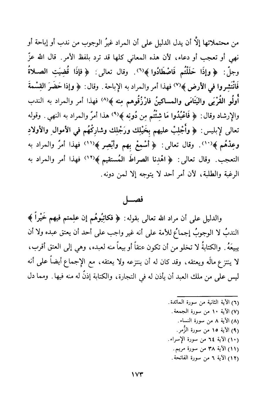 من محتملاتها إلا أن يدل الدليل على أن المراد غير الوجوب من ندب أو إباحة أو نهي أو تعجب أو دعاء، لأن هذه المعاني كلها قد ترد بلفظ الأمر. قال الله عز وجل: {وَإِذَا حَلَلْتُمْ فَاصْطَادُوا} [المائدة: 2]. وقال تعالى: {فَإِذَا قُضِيَتِ الصَّلاةُ فَانْتَشِرُوا فِي الأَرْضِ} [الجمعة: 10] فهذا أمر والمراد به الإباحة. وقال: {وَإِذَا حَضَرَ الْقِسْمَةَ أُولُو الْقُرْبَى وَالْيَتَامَى وَالْمَسَاكِينُ فَارْزُقُوهُمْ مِنْهُ} [النساء: 8] فهذا أمر والمراد به الندب والإرشاد وقال: {فَاعْبُدُوا مَا شِئْتُمْ مِنْ دُونِهِ} [الزمر: 15] هذا أمر والمراد به النهي. وقَوْله تَعَالَى لإبليس: {وَأَجْلِبْ عَلَيْهِمْ بِخَيْلِكَ وَرَجِلِكَ وَشَارِكْهُمْ فِي الأَمْوَالِ وَالأَوْلادِ وَعِدْهُمْ} [الإسراء: 64]. وقال تعالى: {أَسْمِعْ بِهِمْ وَأَبْصِرْ} [مريم: 38] فهذا أمر والمراد به التعجب. وقال تعالى: {اهْدِنَا الصِّرَاطَ الْمُسْتَقِيمَ} [الفاتحة: 6] فهذا أمر والمراد به الرغبة والطلبة، لأن أمر أحد لا يتوجه إلا لمن دونه.