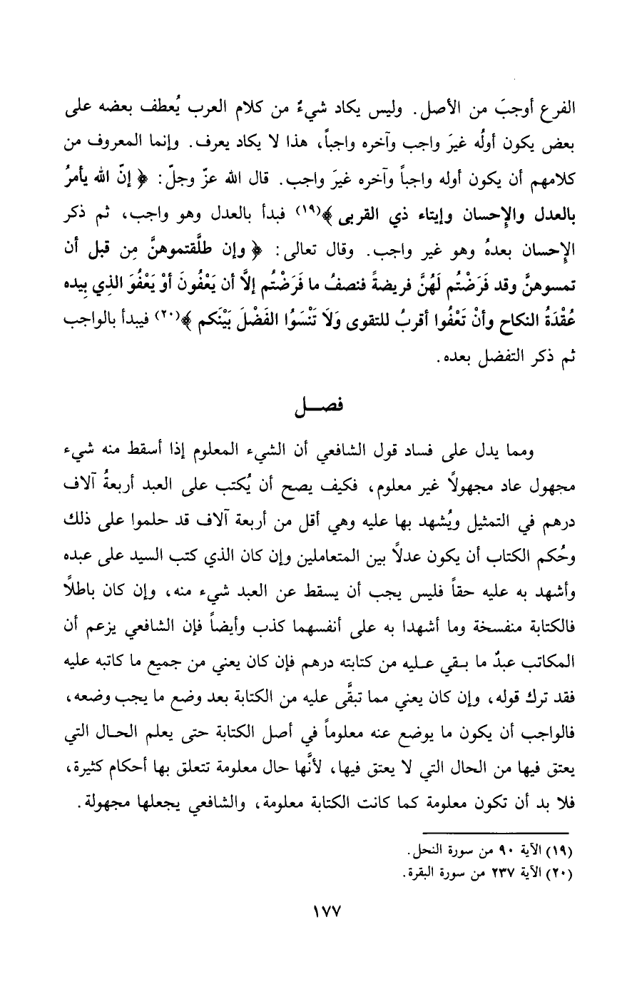 الفرع أوجب من الأصل. وليس يكاد شيء من كلام العرب يعطف بعضه على بعض يكون أوله غير واجب وآخره واجبا، هذا لا يكاد يعرف. وإنما المعروف من كلامهم أن يكون أوله واجبا وآخره غير واجب. قال الله عز وجل: {إِنَّ اللَّهَ يَأْمُرُ بِالْعَدْلِ وَالإِحْسَانِ وَإِيتَاءِ ذِي الْقُرْبَى} [النحل: 90] فبدأ بالعدل وهو واجب، ثم ذكر الإحسان بعده وهو غير واجب. وقال تعالى: {وَإِنْ طَلَّقْتُمُوهُنَّ مِنْ قَبْلِ أَنْ تَمَسُّوهُنَّ وَقَدْ فَرَضْتُمْ لَهُنَّ فَرِيضَةً فَنِصْفُ مَا فَرَضْتُمْ إِلا أَنْ يَعْفُونَ أَوْ يَعْفُوَ الَّذِي بِيَدِهِ عُقْدَةُ النِّكَاحِ وَأَنْ تَعْفُوا أَقْرَبُ لِلتَّقْوَى وَلا تَنْسَوُا الْفَضْلَ بَيْنَكُمْ} [البقرة: 237] فيبدأ بالواجب ثم ذكر التفضل بعده.