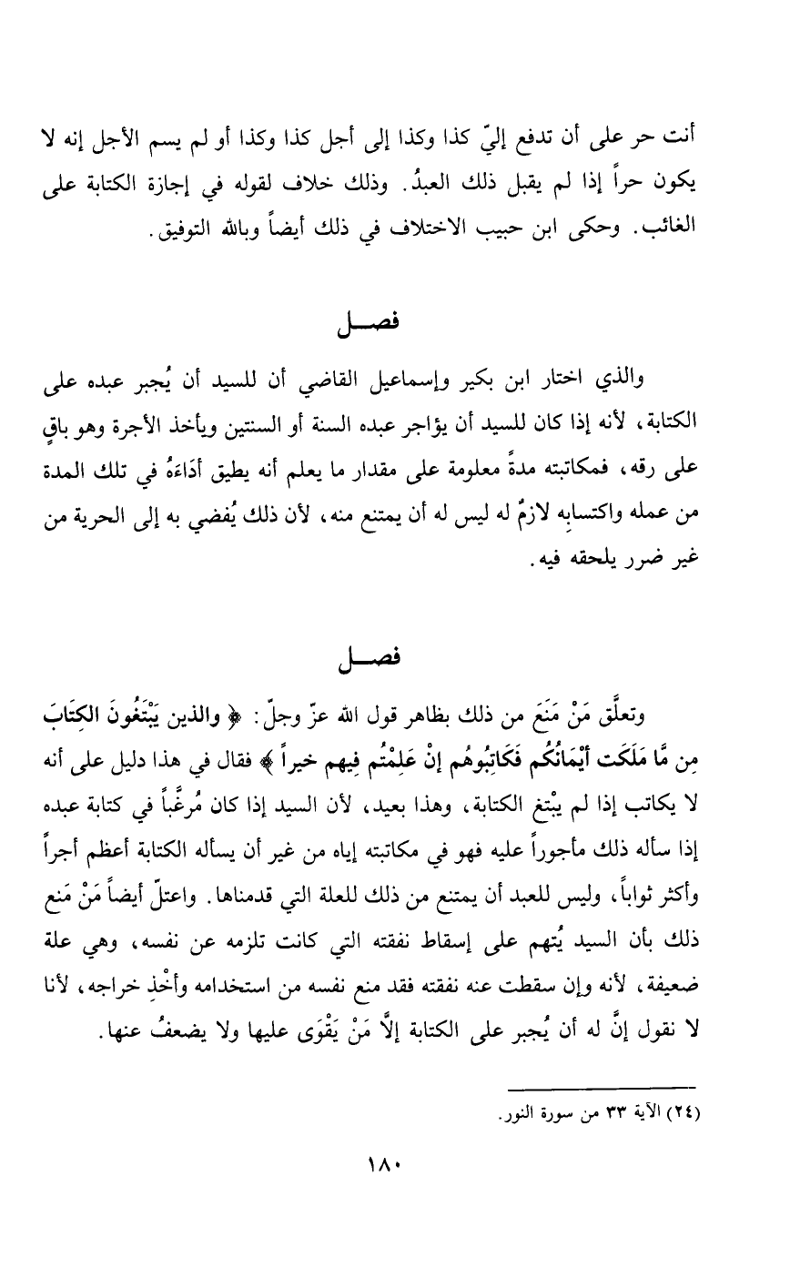 وتعلق من منع من ذلك بظاهر قول الله عز وجل: {فَضْلِهِ وَالَّذِينَ يَبْتَغُونَ الْكِتَابَ مِمَّا مَلَكَتْ أَيْمَانُكُمْ فَكَاتِبُوهُمْ إِنْ عَلِمْتُمْ فِيهِمْ خَيْرًا} [النور: 33] فقال: في هذا دليل على أنه لا يكاتب إذا لم يبتغ الكتابة، وهذا بعيد، لأن السيد إذا كان مرغبا في كتابة عبده إذا سأله ذلك مأجورا عليه فهو في مكاتبته إياه من غير أن يسأله الكتابة أعظم أجرا وأكثر ثوابا، وليس للعبد أن يمتنع من ذلك للعلة التي قدمناها. واعتل أيضا من منع ذلك بأن السيد يتهم على إسقاط نفقته التي كانت تلزمه عن نفسه، وهي علة ضعيفة، لأنه وإن سقطت عنه نفقته فقد منع نفسه من استخدامه وأخذِ خراجه، لأنا لا نقول: إن له أن يجبر على الكتابة إلا من يقوى عليها ولا يضعف عنها.