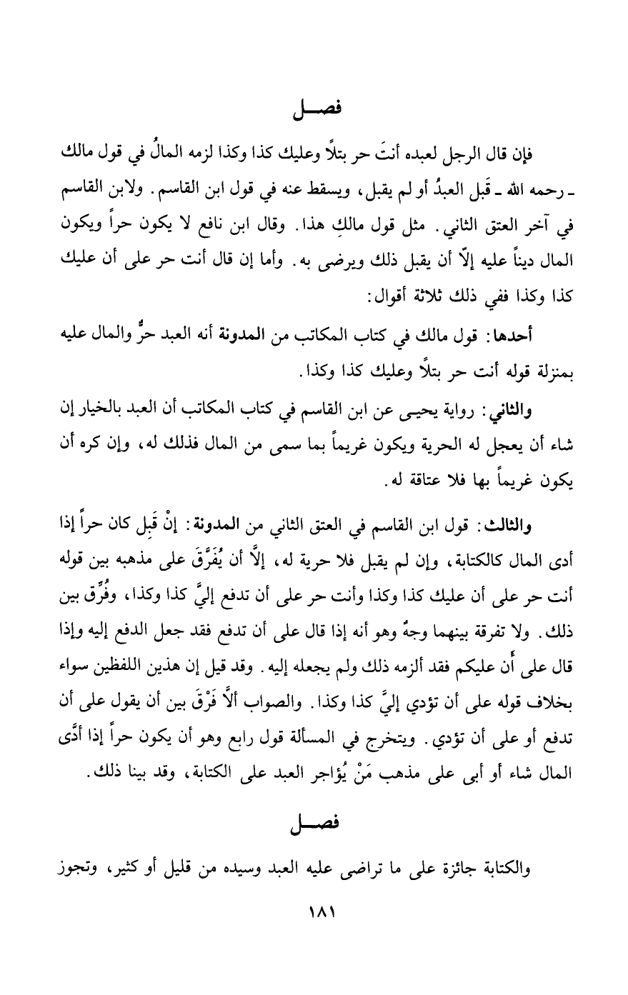 فإن قال الرجل لعبده: أنت حر بتلا وعليك كذا وكذا؛ لزمه المال في قول مالك - رَحِمَهُ اللَّهُ - قَبِل العبد أو لم يَقْبل، ويسقط عنه في قول ابن القاسم. ولابن القاسم في آخر العتق الثاني مثل قول مالك هذا. وقال ابن نافع: لا يكون حرا ويكون المال دينا عليه إلا أن يقبل ذلك ويرضى به. وأما إن قال: أنت حر على أن عليك كذا وكذا؛ ففي ذلك ثلاثة أقوال: