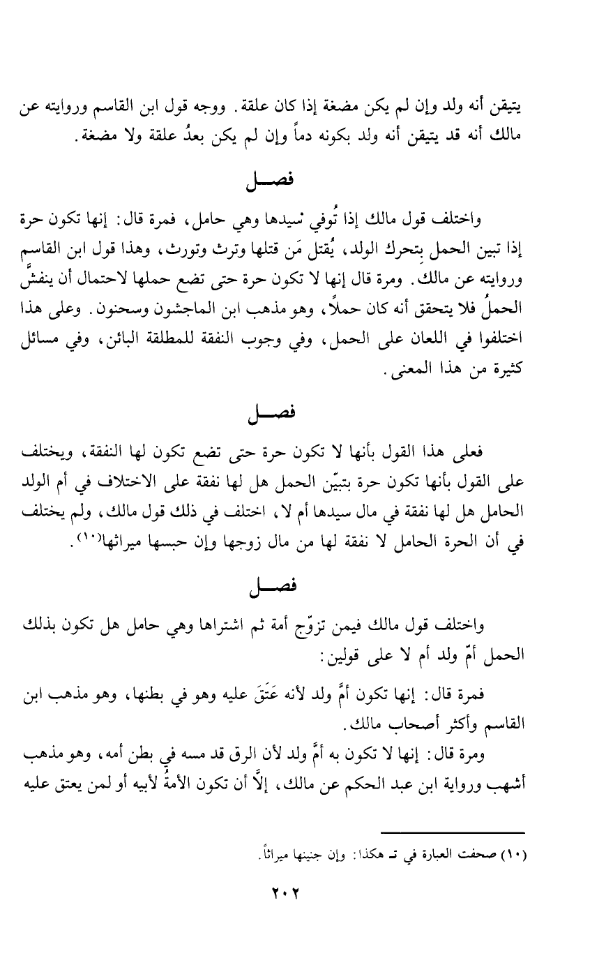 واختلف قول مالك إذا توفي سيدها وهي حامل، فمرة قال: إنها تكون حرة إذا تبين الحمل بتحرك الولد، يقتل من قتلها وترث وتورث، وهذا قول ابن القاسم وروايته عن مالك. ومرة قال: إنها لا تكون حرة حتى تضع حملها لاحتمال أن ينفشَّ الحمل فلا يتحقق أنه كان حملا، وهو مذهب ابن الماجشون وسحنون. وعلى هذا اختلفوا في اللعان على الحمل، وفي وجوب النفقة للمطلقة البائن، وفي مسائل كثيرة من هذا المعنى.