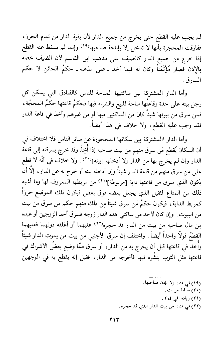 وأما الدار االمشتركة بين سكانها المحجورة عن سائر الناس فلا اختلاف في أن السكان يقطع من سرق منهم من بيت صاحبه إذا أخذ وقد خرج بسرقته إلى قاعة الدار وإن لم يخرج بها من الدار ولا أدخلها. ولا خلاف في أنه لا قطع على من سرق منهم من قاعة الدار شيئا وإن أدخله بيته أو خرج به عن الدار، إلا أن يكون الذي سرق من قاعتها دابة من مربطها المعروف لها وما أشبه ذلك من المتاع الثقيل الذي يجعل بعضه فوق بعض فيكون ذلك الموضع حرزا كمربط الدابة، فيكون حكم من سرق شيئا من ذلك منهم حكم من سرق من بيت من البيوت. وإن كان لأحد من ساكني هذه الدار زوجة فسرق أحد الزوجين أو عبده من مال صاحبه من بيت من الدار قد حجره عليهما أو أغلقه دونهما فعليهما القطع قولا واحدا أيضا. واختلف إن سرق الأجنبي من بيت من يموت الدار شيئا وأخذ في قاعتها قبل أن يخرج به من الدار، أو سرق مما وضع بعض الأشراك في قاعتها مثل الثوب ينشره فيها فأخرجه من الدار، فقيل: إنه يقطع به في الوجهين