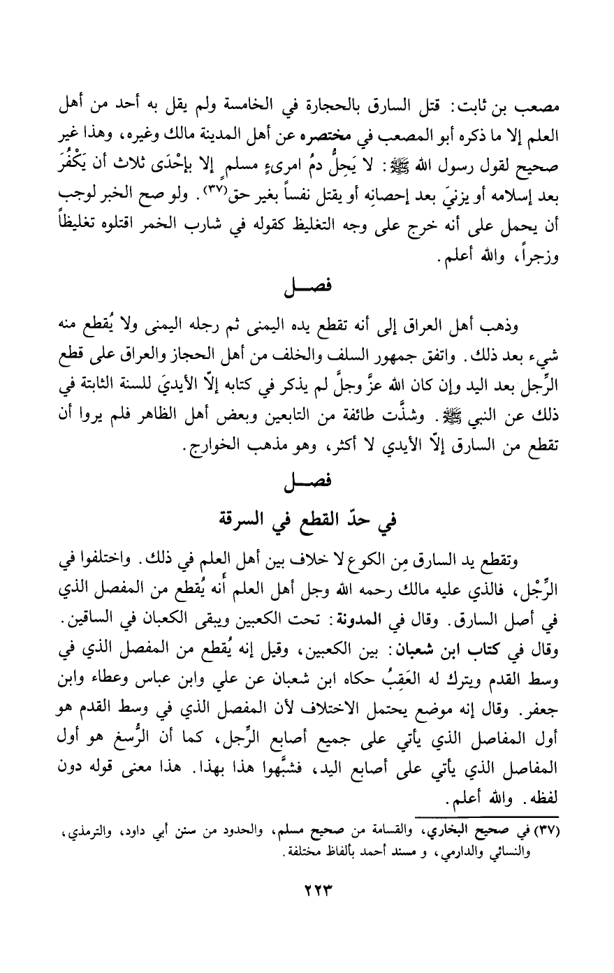 وتقطع يد السارق من الكوع لا خلاف بين أهل العلم في ذلك. واختلفوا في الرجل، فالذي عليه مالك - رَحِمَهُ اللَّهُ - وجل أهل العلم أنه يقطع من المفصل الذي في أصل السارق. وقال في المدونة: تحت الكعبين ويبقى الكعبان في الساقين. وقال في كتاب ابن شعبان: بين الكعبين، وقيل إنه يقطع من المفصل الذي في وسط القدم ويترك له العقب حكاه ابن شعبان عن علي وابن عباس وعطاء وابن جعفر. وقال إنه موضع يحتمل الاختلاف لأن المفصل الذي في وسط القدم هو أول المفاصل الذي يأتي على جميع أصابع الرجل، كما أن الرسغ هو أول المفاصل الذي يأتي على أصابع اليد، فشبهوا هذا بهذا. هذا معنى قوله دون لفظه. والله أعلم.