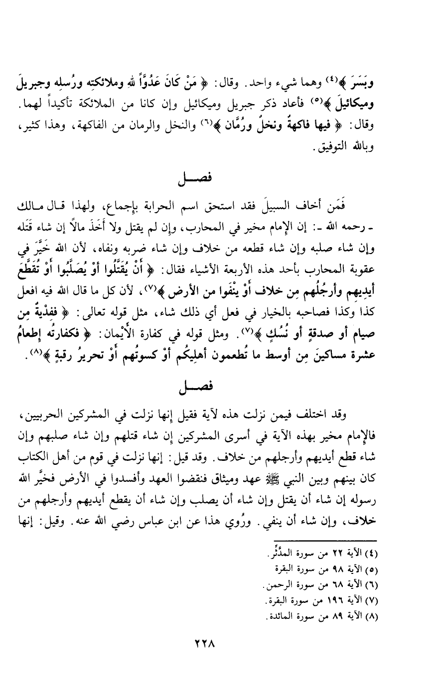 فمن أخاف السبيل فقد استحق اسم الحرابة بإجماع، ولهذا قال مالك - رَحِمَهُ اللَّهُ -: إن الإمام مخير في المحارب، وإن لم يقتل ولا أخذ مالا إن شاء قتله وإن شاء صلبه وإن شاء قطعه من خلاف وإن شاء ضربه ونفاه، لأن الله خير في عقوبة المحارب بأحد هذه الأربعة الأشياء فقال: {أَنْ يُقَتَّلُوا أَوْ يُصَلَّبُوا أَوْ تُقَطَّعَ أَيْدِيهِمْ وَأَرْجُلُهُمْ مِنْ خِلافٍ أَوْ يُنْفَوْا مِنَ الأَرْضِ} [المائدة: 33]، لأن كل ما قال الله فيه افعل كذا أو كذا فصاحبه بالخيار في فعل أي ذلك شاء، مثل قَوْله تَعَالَى: {فَفِدْيَةٌ مِنْ صِيَامٍ أَوْ صَدَقَةٍ أَوْ نُسُكٍ} [البقرة: 196]. ومثل قوله في كفارة الأيمان: {فَكَفَّارَتُهُ إِطْعَامُ عَشَرَةِ مَسَاكِينَ مِنْ أَوْسَطِ مَا تُطْعِمُونَ أَهْلِيكُمْ أَوْ كِسْوَتُهُمْ أَوْ تَحْرِيرُ رَقَبَةٍ} [المائدة: 89].