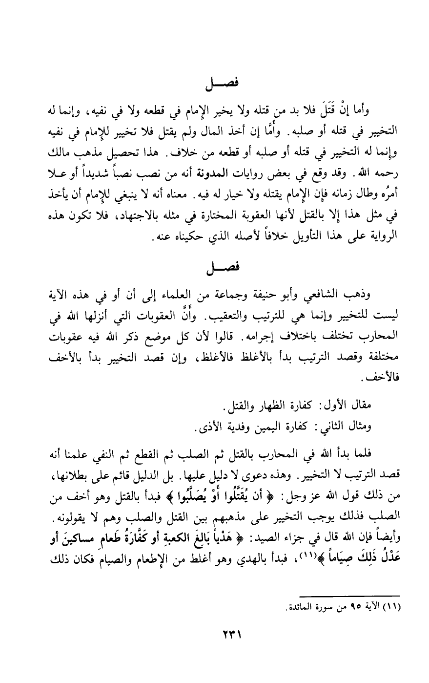 وأما إن قتل فلا بد من قتله ولا يخير الإمام في قطعه ولا في نفيه، وإنما له التخيير في قتله أو صلبه. وأما إن أخذ المال ولم يقتل فلا تخيير للإمام في نفيه وإنما له التخيير في قتله أو صلبه أو قطعه من خلاف. هذا تحصيل مذهب مالك - رَحِمَهُ اللَّهُ -. وقد وقع في بعض روايات المدونة أنه من نصب نصبا شديدا أو علا أمره وطال زمانه فإن الإمام يقتله ولا خيار له فيه. معناه أنه لا ينبغي للإمام أن يأخذ في مثل هذا إلا بالقتل لأنها العقوبة المختارة في مثله بالاجتهاد، فلا تكون هذه الرواية على هذا التأويل خلافا لأصله الذي حكيناه عنه.