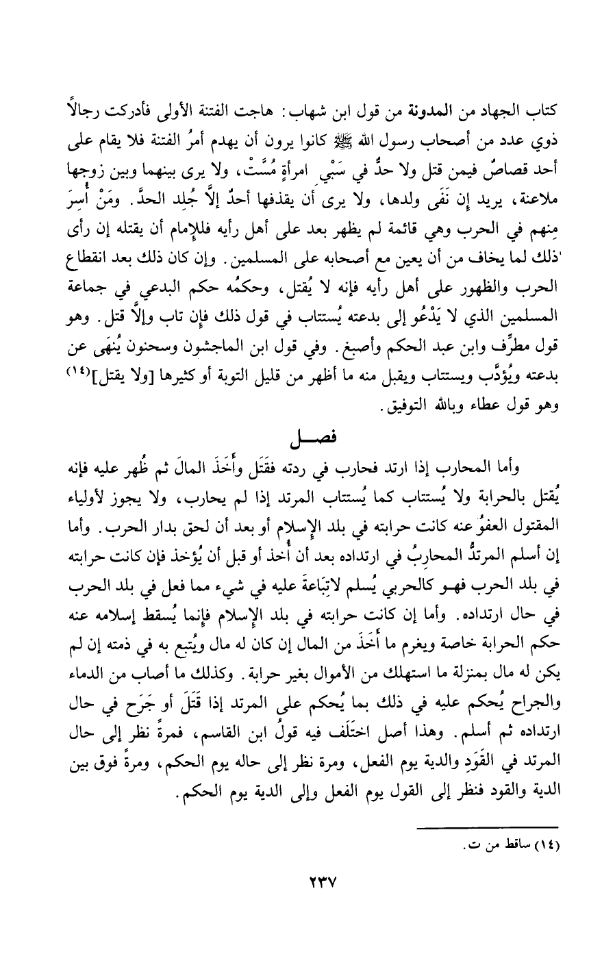 كتاب الجهاد من المدونة من قول ابن شهاب: هاجت الفتنة الأولى فأدركت رجالا ذوي عدد من أصحاب رسول الله - صَلَّى اللَّهُ عَلَيْهِ وَسَلَّمَ - كانوا يرون أن يهدم أمر الفتنة فلا يقام على أحد قصاص فيمن قتل ولا حد في سبي امرأة مست، ولا يرى بينهما وبين زوجها ملاعنة، يريد إن نفى ولدها، ولا يرى أن يقذفها أحد إلا جلد الحد. ومن أسر منهم في الحرب وهي قائمة لم يظهر بعد على أهل رأيه فللإمام أن يقتله إن رأى ذلك لما يخاف من أن يعين مع أصحابه على المسلمين. وإن كان ذلك بعد انقطاع الحرب والظهور على أهل رأيه فإنه لا يقتل، وحكمه حكم البدعي في جماعة المسلمين الذي لا يدعو إلى بدعته يستتاب في قول ذلك فإن تاب وإلا قتل. وهو قول مطرف وابن عبد الحكم وأصبغ. وفي قول ابن الماجشون وسحنون ينهى عن بدعته ويؤدب ويستتاب ويقبل منه ما أظهر من قليل التوبة أو كثيرها وهو قول عطاء وبالله التوفيق.